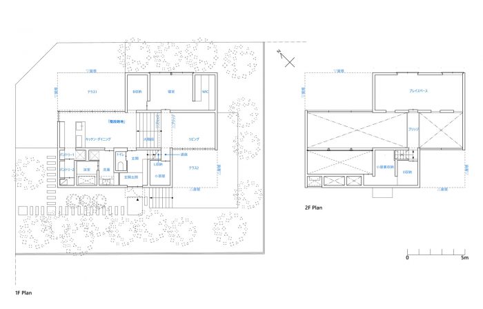 The open spaces: dining kitchen space on the same level as the front road, a two-story atrium living space below the grand stairs, roofed terrace spaces on the north side of the dining space and on the south side of the living space, become a hook-shaped (Z-shaped) alley space which half of the alley is interior while the other half is outside space. We arranged two building masses diagonally, a southwestern block of sanitary spaces on the 1st floor and a northeastern block of the master bedroom and 2nd-floor playroom (future children’s room), and built a bridge between the two masses that accesses the playroom. At the same time, the bridge crosses over the open alley.