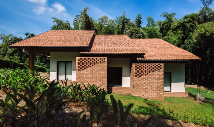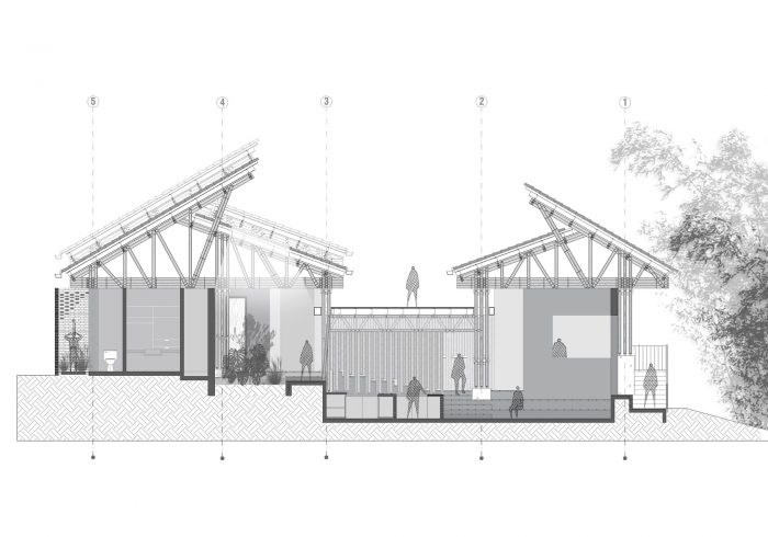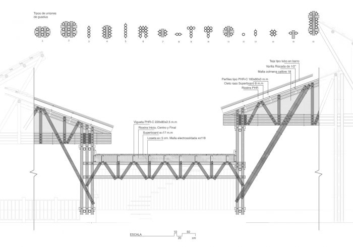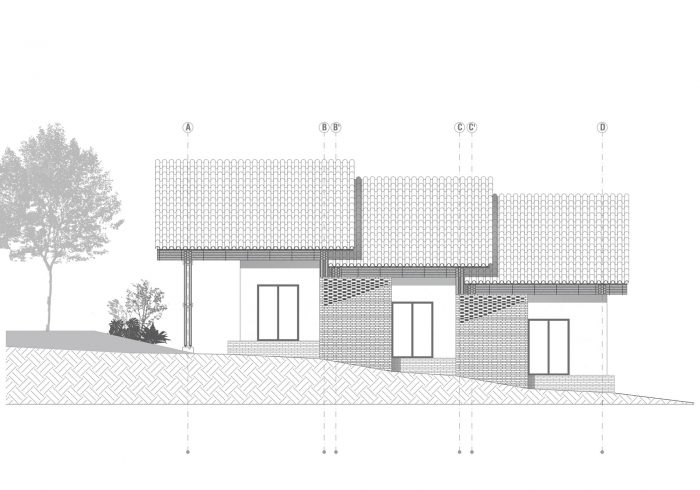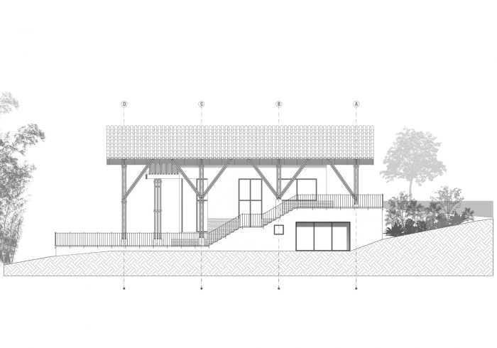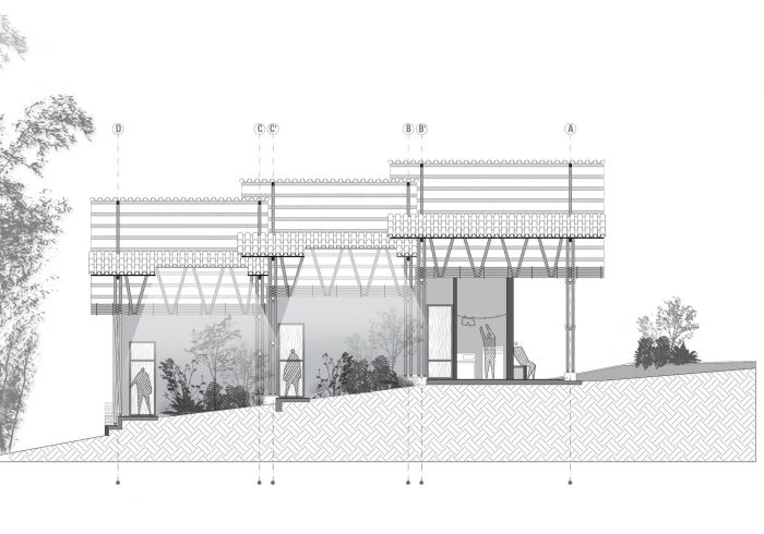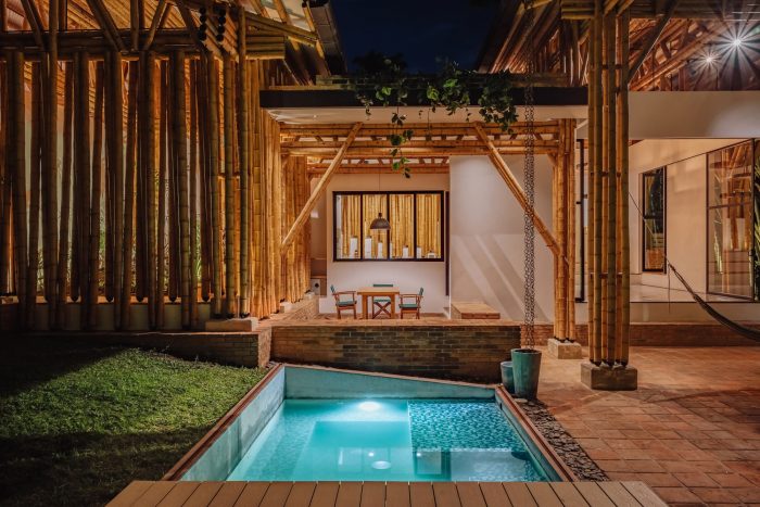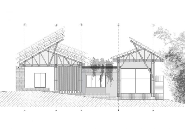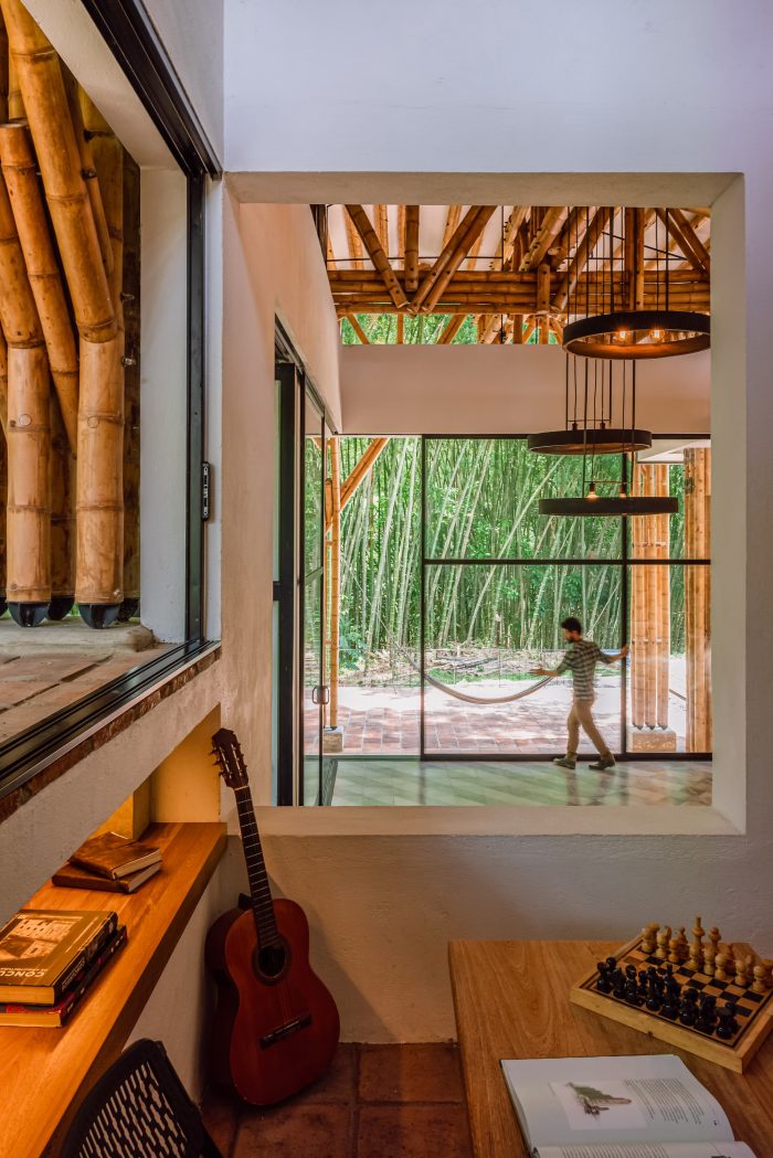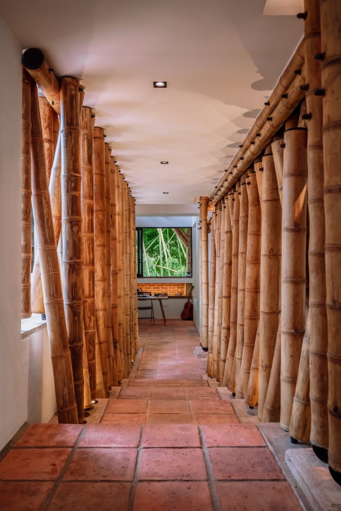 The project integrates the principle of assigning areas for different activities, formulated by Hungarian architect Marcel Breuer. As a result, the house is divided into two cores: a leisure wing and a gathering wing. In its formal structure, the leisure area is enclosed by a gable roof partitioned into three units. By contrast, the gathering area is sheltered under both a continuous gable roof and a habitable rooftop inspired by the modernist movement. Thereby, leisure and gathering spaces interact irregularly with each other through the guadua screen. This curtain-like segmentation shapes the façade, while folding inwards to bring the vertical guadua into the home and creating a stately descending entryway to the social area, thus reinforcing the blurred connection between both cores.