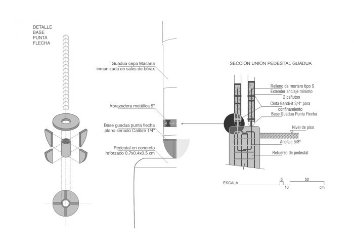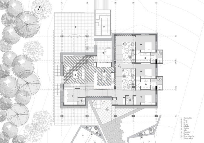 The house prioritizes its gathering area as a broad space that generates interaction on different levels while keeping the hierarchy between rooms filled with singularity and proportion. A guadua tunnel acts as framing for the forest at its end and builds expectation by revealing glances of what happens downstairs. The living room access goes from narrowness to openness, where the viewer’s attention is absorbed by the shadowlike strips projected on the cement tiles as if originated in the forest. At the same level, the kitchen is located at the heart of the house, where the absence of walls allows a peripheral relation to its surrounding rooms. The dining room, roofed yet open-ended, works as a middle ground between the inside and outside of the house’s cladding. Here, partially shielded by a guaduaportico, the terrace is frequented by local exotic wildlife.