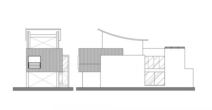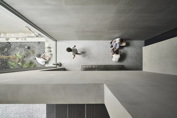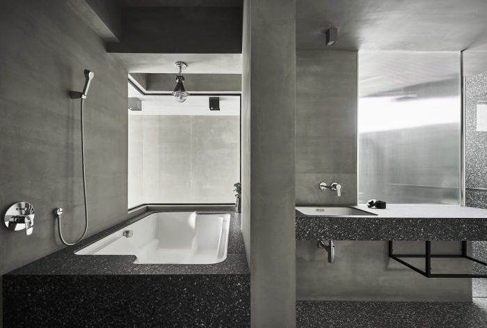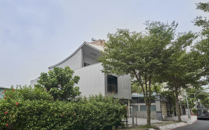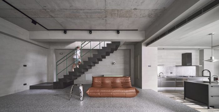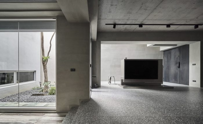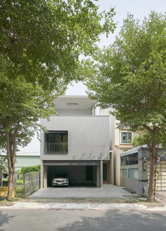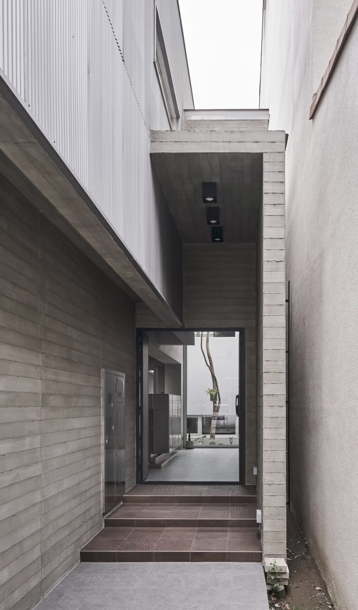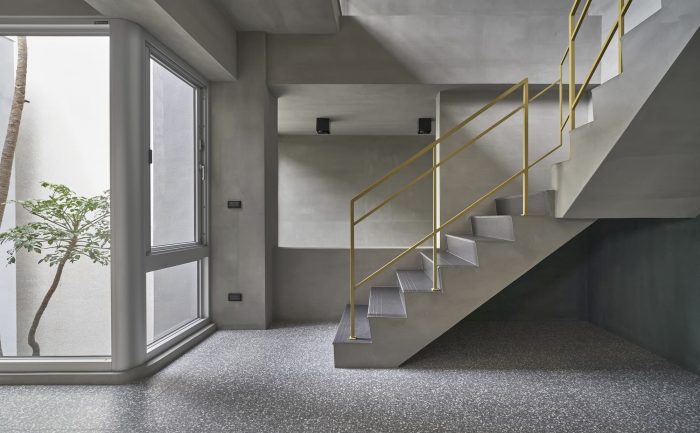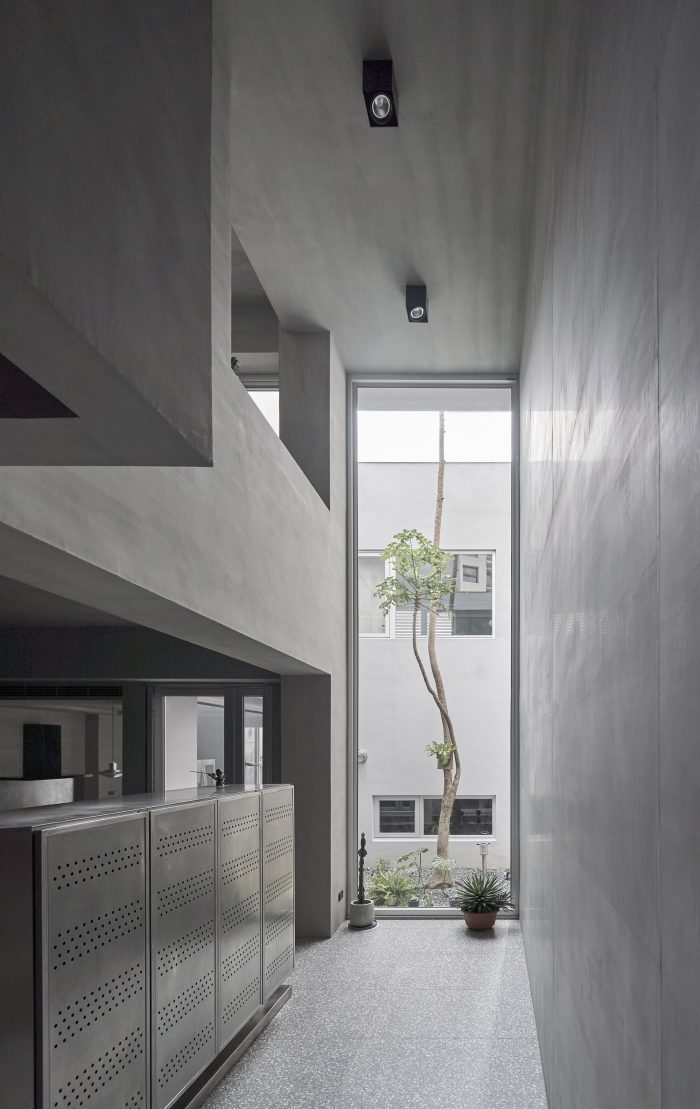 The façade’s texture is comprised of raw concrete-effect plaster and anodized metal corrugated sheets. The roughness of the raw concrete, which features faux wood grain created by searing the wood grain onto the concrete surface, and the elegance of the misty silver corrugated sheets create a visually striking contrast. The stairs are paved with rusted iron pattern tiles, which differ from the expression of the metal pattern on the corrugated sheets. Although the materials themselves seem common, they are presented in a fresh and innovative way, giving them a unique and distinctive appearance. The walls of the house are coated with smudged concrete plaster, and the ground is paved with terrazzo.