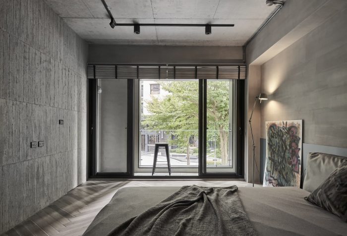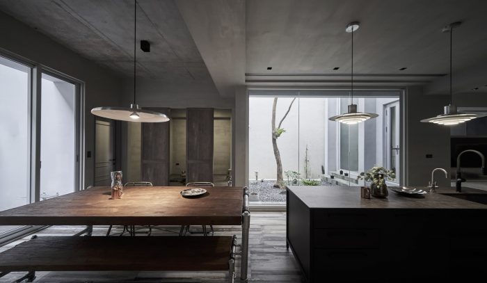 At the entrance, a tree in the tiânn can be seen through a partially elevated floor-to-ceiling window, providing a sense of ritual for coming home. The air-tight door on the side is the entrance into the green land. Downstairs, the open kitchen on the corner features a whole fixed window without extra lines of window frames. One can have a panoramic view from the window as if he or she is watching a painting changing with time. The tatami room/guest room has a lower window, allowing natural light from tiânn to filter in, creating a serene and laid-back atmosphere. The backyard garden with plants on the board allows sunshine and greenery everywhere. Ascending the stairs to the private space on the second floor, the inner courtyard expands throughout the entire building, from the horizontal surface to the vertical elevation. The tree in the tiânn-like courtyard can be admired from windows on three different levels, and its verdant foliage is visible even from the master bathroom’s bay window, lending a romantic atmosphere.