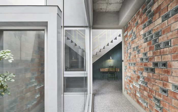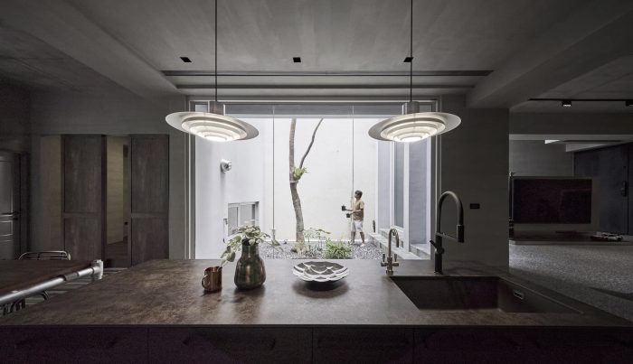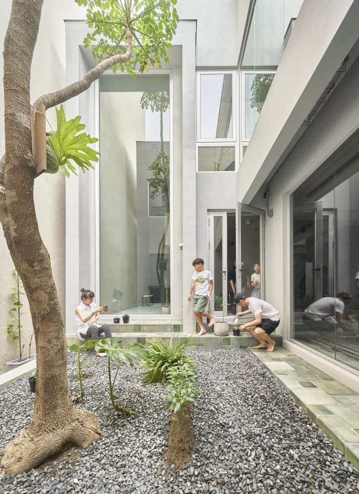The traditional co-living form of three generations under one roof has evolved to meet changing family structures. The co-living form of one generation or two generations has become common nowadays. Modern living now prioritizes independence. Even the elders now desire their own personal living spaces, while younger members live nearby to care for them. As a result, modern housing is being reimagined to meet these needs of the modern living style. The common area is on the first floor, while the second floor contains the bedrooms, and the third floor includes a patio and ancestor shrine. The long layout of townhouses created an unavoidable challenge in introducing light to the center of the building. The owners also desired a piece of land so that they could accompany their children to get touch the soil, grow vegetables, and enjoy the changing seasons. Where there is a land of green, there is light.