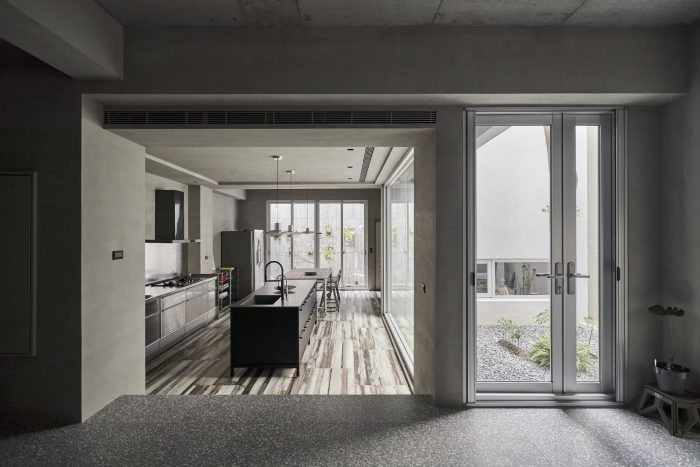 With this in mind, I designed the layout centered on the green land with family living areas around in this narrow and long space. The design concept is akin to the “tiânn” (yard) in Sanheyuan. Tiânn is the place for grain drying, bouquet, and family communication in the early times. Compared to the openness in the past, the tiânn-like land here is more hidden, serving as a modern Sanheyuan. The lobby, living room, kitchen, dining room to tatami room correspond to the main building and “protecting dragons” (hùlóng, the wings of Sanheyuan) on the left and right of the traditional residence, enclosing the “tiânn” exclusively to the family. With various window styles and the retreating layout, the light is led into the rooms and nature is within reach.