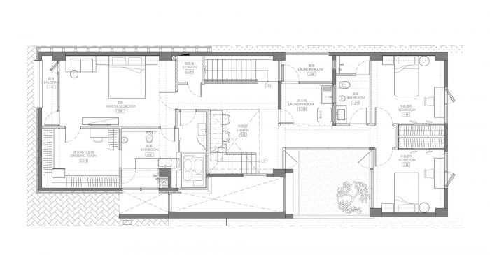 楼梯之间的空隙有一个设计目的,允许院子的自然美景连接主卧室和两个儿童房。该空隙也向三楼的顶楼开放,为祖先的神龛提供了一个角落空间,或为未来的使用提供了一个缓冲空间。天井邀请自然光涌入二楼,照亮了这个区域。在最终确定内部布局后,我将注意力从建筑内部转移到建筑外部。为了创造一种清晰的预期感,我设计了前院,将建筑主体缩回,并撤去一条相对隐蔽的走廊,暗示门后的美丽世界。业主对灰色和金属元素的偏爱成为我的灵感来源,从而在房子的外墙上形成了整齐的现代主义线条和个性化的想象形状。除了硬朗的外墙,还加入了一条柔和的曲线,巧妙地传达了三合院的斜屋顶形象。