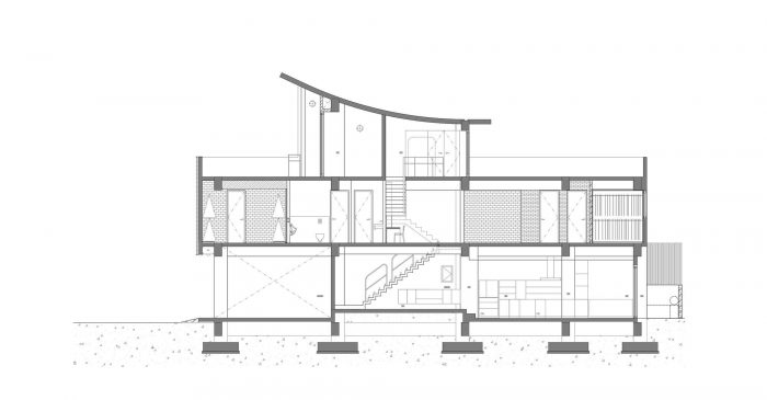 立面的纹理由原始混凝土效果的石膏和阳极氧化金属波纹板组成。原始混凝土的粗糙,其特点是通过在混凝土表面烧制木纹而形成的仿木纹,与缥缈的银色波纹板的优雅形成了视觉上的强烈对比。楼梯上铺设了生锈的铁质图案瓷砖,这与波纹板上的金属图案的表达方式不同。虽然这些材料本身看起来很普通,但它们被以一种新鲜和创新的方式呈现出来,使它们具有独特和与众不同的外观。房屋的墙壁上涂有污浊的混凝土石膏,地面上铺设了水磨石。