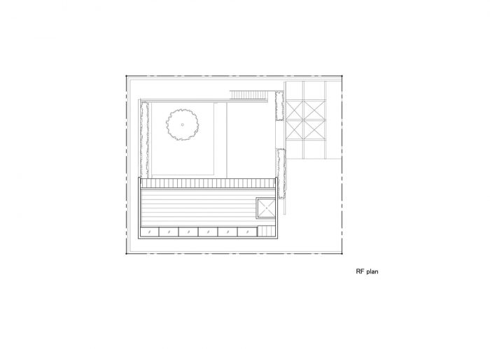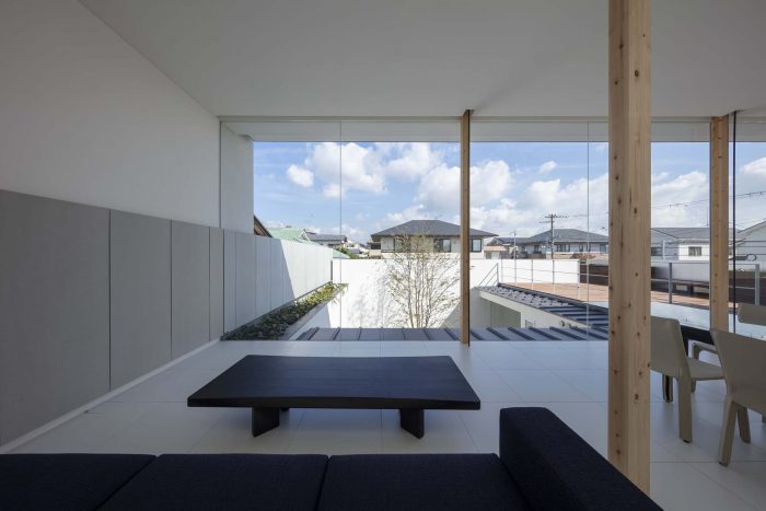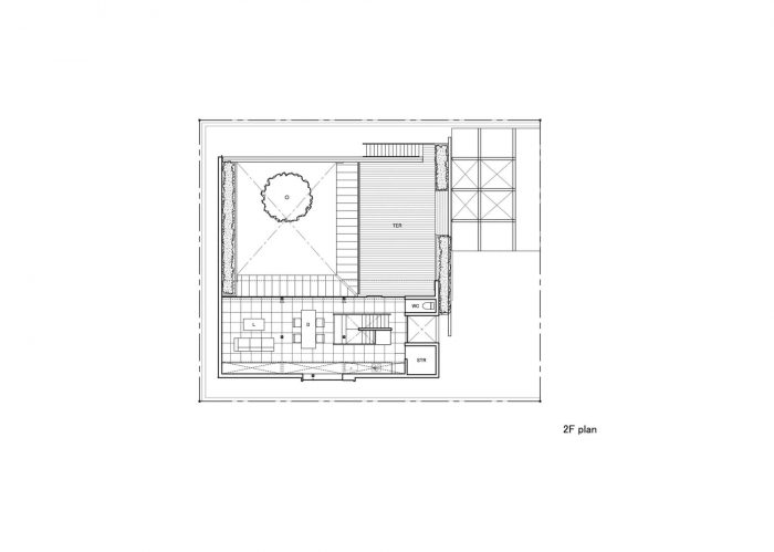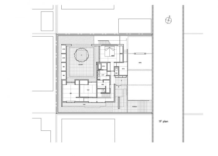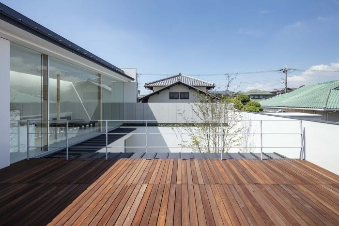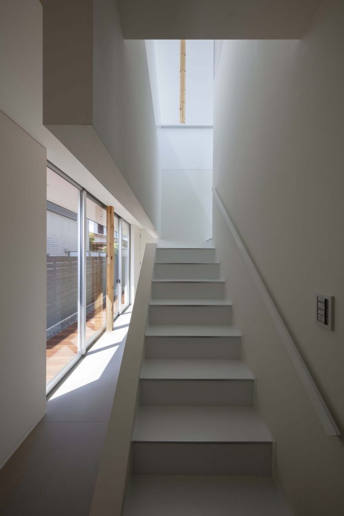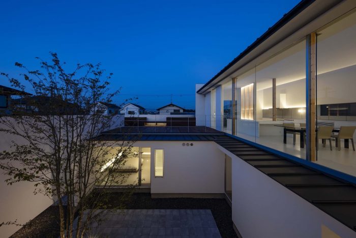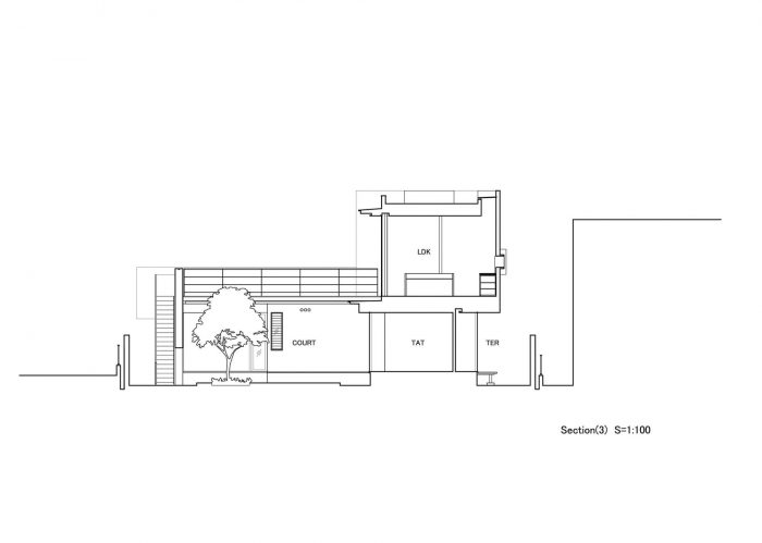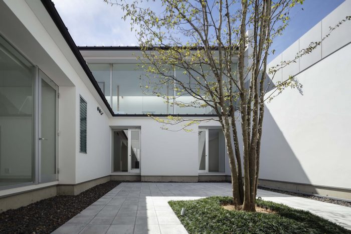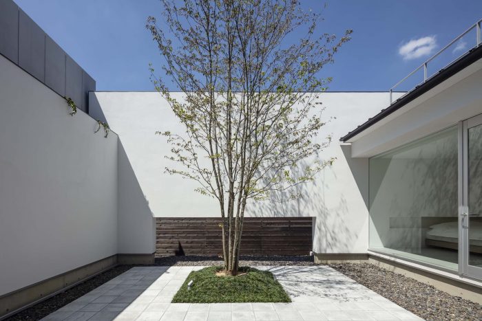 The first floor is in L-shape with a courtyard at the northwest corner and is a highly private space for the family. To the east is the master bedroom, and to the south are the child’s room and a Japanese-style room: they all face the courtyard in the northwest. But to avoid the views towards the courtyard from each room, overlapping with each other, the openings to the courtyard have been kept relatively small to secure an independent courtyard view.