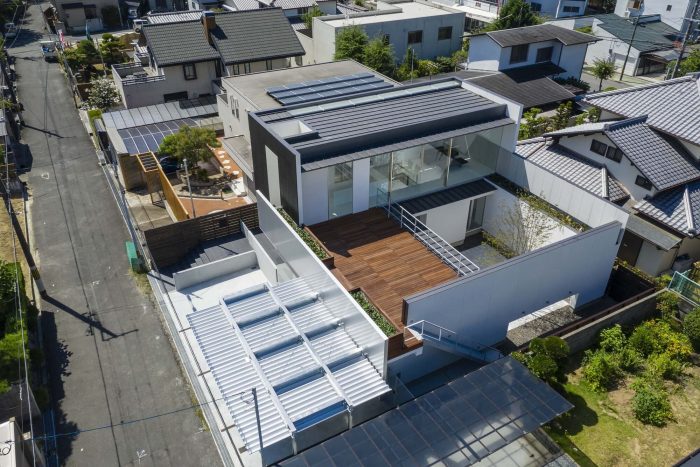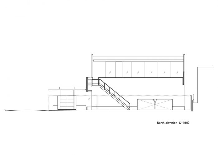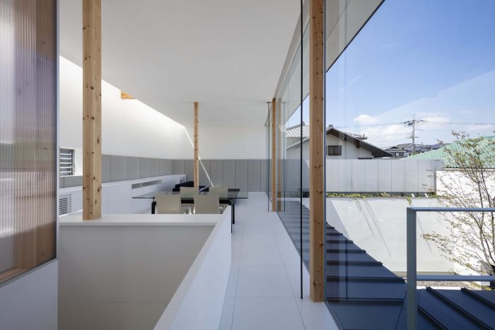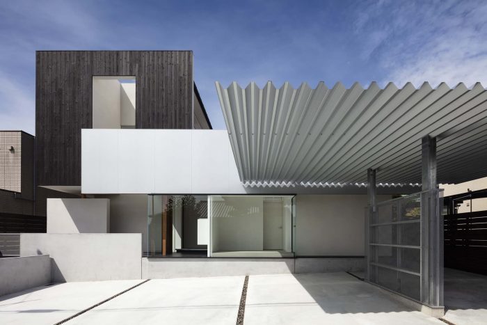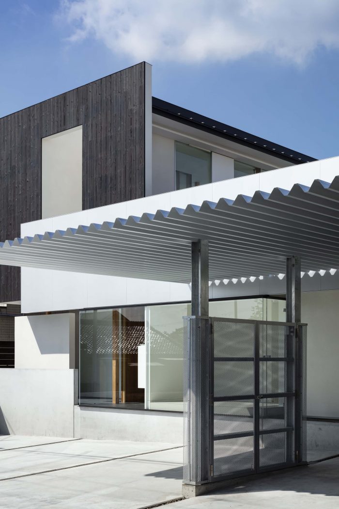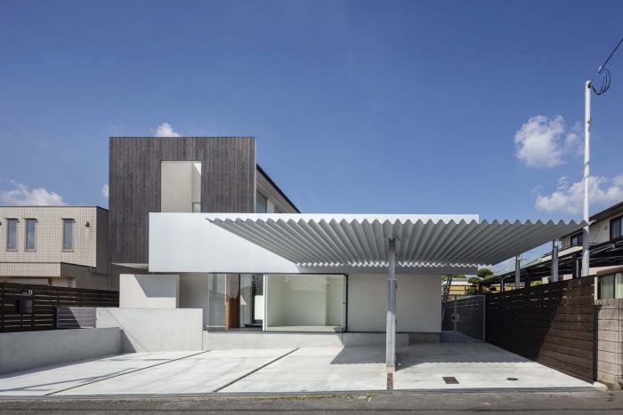 This is a house for a small family of husband+wife+child, located on the outskirts of Nara. A parking space facing the road in front, extends the full width of the front opening, as to accommodate all the cars for daily use and the motorbikes for the owner’s hobby. This is why the façade is set back to give space to the parking area. The building itself projects a closed image, except for the hobby area on the first floor, which is a wide open space with glass openings facing the collection of motorbikes.