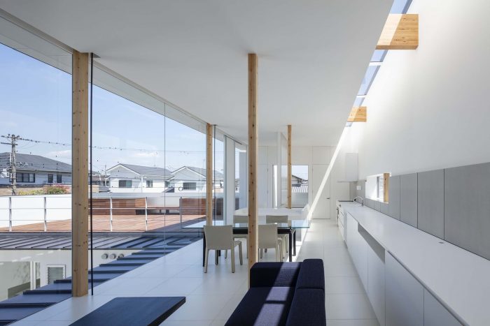 In contrast to this layout, the living space on the second floor is located to the south, with a big opening facing the scenery in the north. The ceiling height is 3.2 meters and this height is emphasized by the skylight at the top of the southern wall. Also, this living/dining area overlooks the wooden deck on top of the master bedroom below, with the stable light coming in from the view on the north. This way, the living/dining space gives the feeling of almost living in an outdoor space. The view to the north extends horizontally, whereas the sunlight from the skylight on the southside pours in vertically.