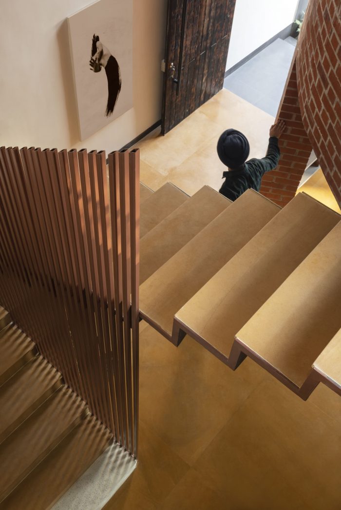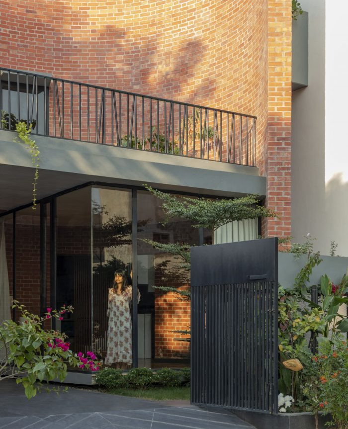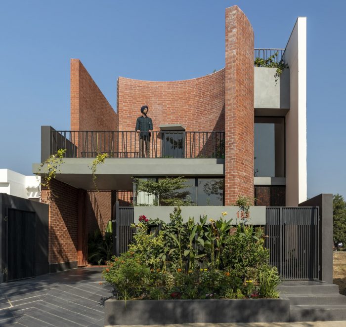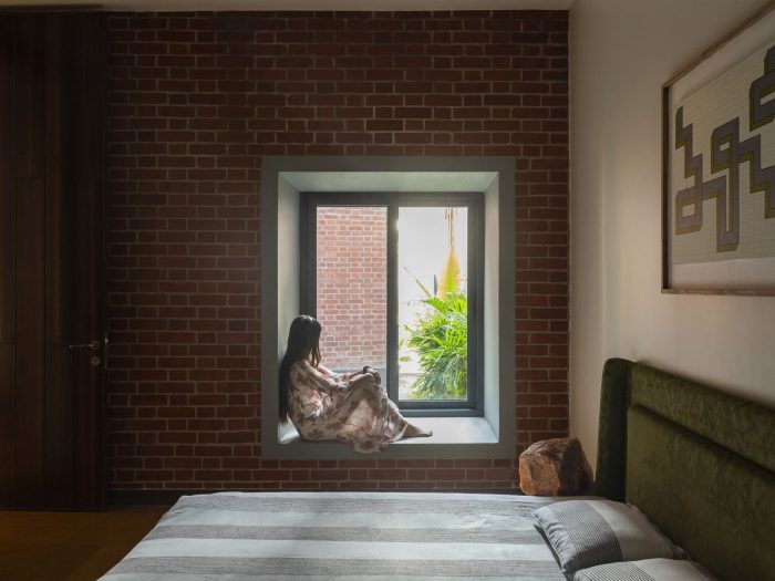 Learning from the original material character of Amritsar, the home is built entirely with exposed brick walls, breaking away from typical urban developments which use trend-based cladding or applied façade finishes – which have made the city an amalgamation of incoherent architectural characters. Returning to brick, which is produced locally, is an attempt to lend a sense of belonging to the home while imparting a timeless aesthetic quality. This, combined with yellow Jaisalmer stone that sweeps the floor of the house, serves its users with minimal maintenance, graceful weathering, and a bare, tactile finish.