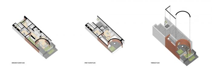 In response to Amritsar’s extreme climate, with temperatures dropping to 0deg in winter and rising to 45deg in the summer, mass placements and terrace projections are carefully planned to shield the interior in the summer while allowing the winter sun in from the south. The winds running east-west are trapped, accelerated, and humidified by the long and narrow courtyard garden, which brings daylight, air, and a view of the landscape to almost all rooms. Blurring the line between inside and outside, bay windows serve as little nooks that open into the garden, serving as moments of pause and relief. The ground floor fits the main functions - the living, kitchen, dining, and two bedrooms, with just a lounge and guest bedroom on the upper floor, that overlooks the courtyard. This flows into a first-floor terrace garden facing the road.