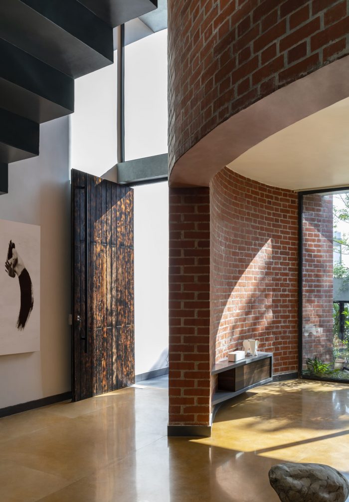 从阿姆利则的原始材料特征中学习,该住宅完全用裸露的砖墙建造,摆脱了典型的城市开发项目,这些项目使用基于潮流的包层或应用外墙装饰,使城市成为不连贯的建筑特征的混合体。回到本地生产的砖头,是为了给家带来归属感,同时赋予永恒的美学品质。这与扫过房子地板的黄色Jaisalmer石相结合,以最少的维护、优雅的风化和裸露的触感为用户服务。