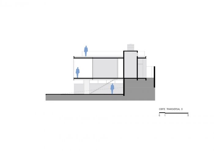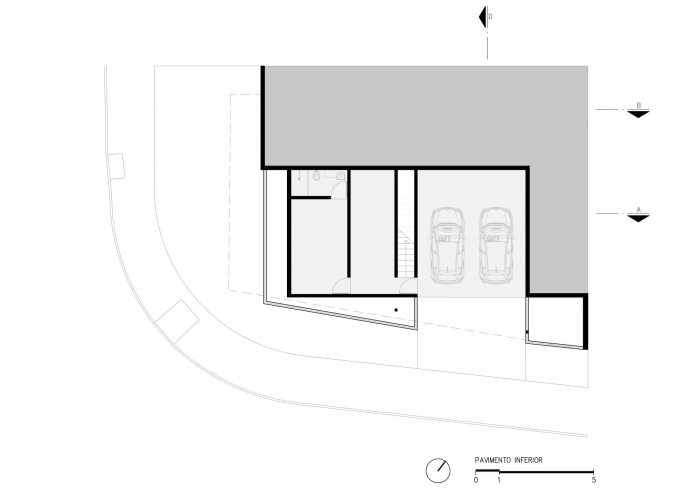 在这种形态下,该项目分两层实施--一层在最低层,入口在最大的外墙,车库、储藏室、客房和办公室位于这里;另一层从最小的外墙进入,房子的程序位于这里。3间卧室,客厅,餐厅,阳台和服务。