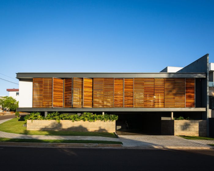 With this morphology, the project was implemented on two levels – one on the lowest level with entrance through the largest facade where the garage, storage room, a guest room, and an office are located; and another with access from the smallest facade, where the program of the house is located: 3 bedrooms, living room, dining room, balconies, and service.