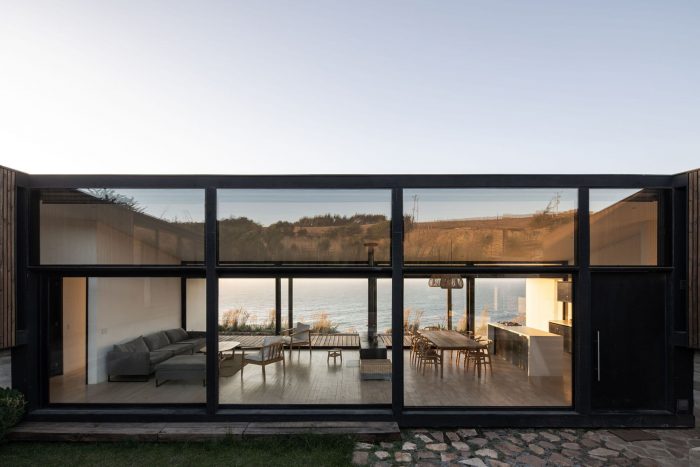 Therefore, a "U" shaped volume was proposed, which would be placed in such a way that there would be 2 parallel and hermetic volumes on their faces towards the neighboring boundaries, and the third, totally permeable, and parallel to the coastal edge. As a result of this configuration, in the center, there would be an outdoor patio protected from the wind, which would have the particularity of being visually connected to the sea through the double-glazed common area. The space of the common areas would be the central axis of the house, while the rest of the programmatic elements (bedrooms, bathrooms, laundry, and roofed parking area), would be distributed in the 2 volumes perpendicular to it. Due to the tightness of its north and south facades, semi-open courtyards were proposed to provide better lighting and ventilation to some rooms. In addition, these patios would allow us to have a view of the sea in some cases.