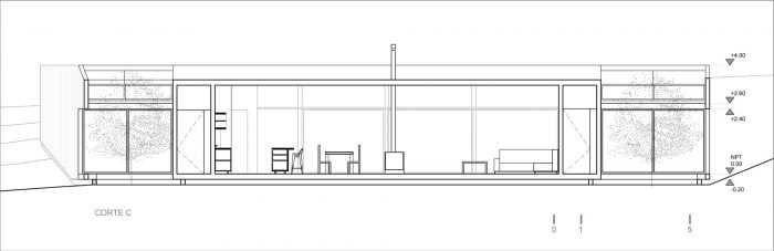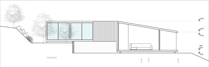 The main structure of the house is composed of metal framing, to build large spaces without support (especially in the common areas), and the secondary structure is composed of impregnated pine. For the exterior cladding, a vertical grid of 2 "x1" impregnated brushed pine was designed, which functions as a lattice in the roofed parking area.
