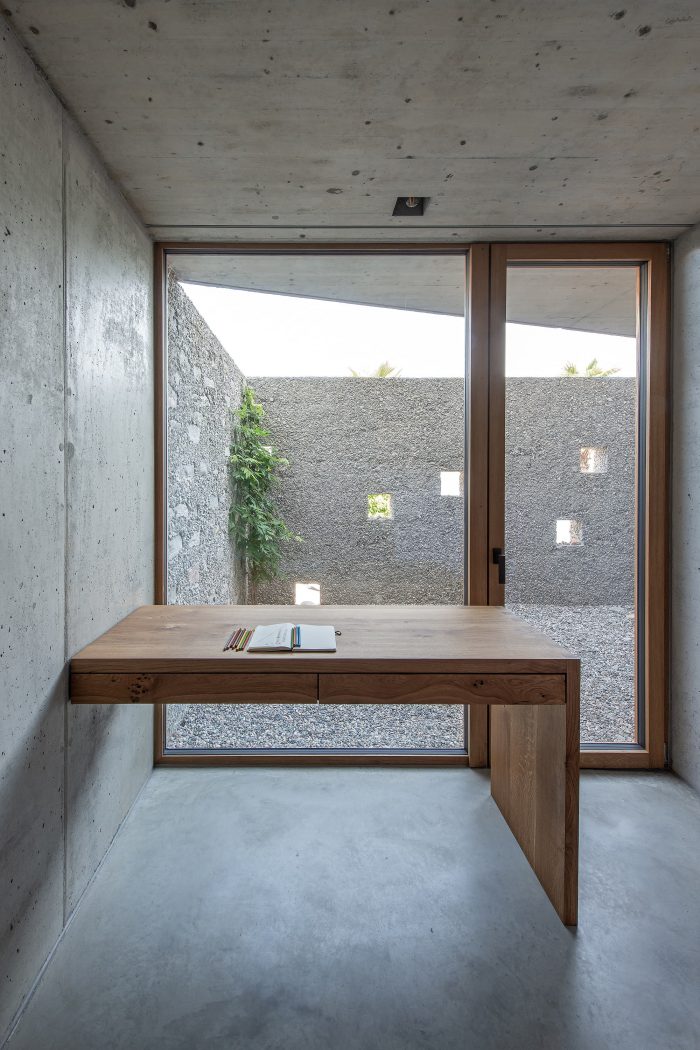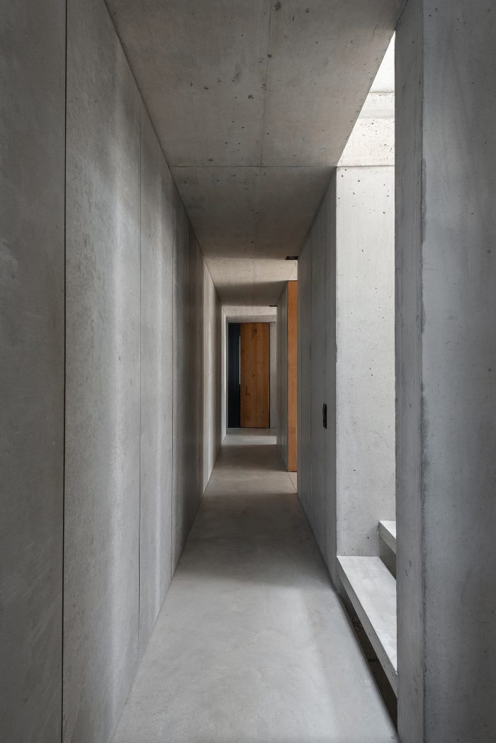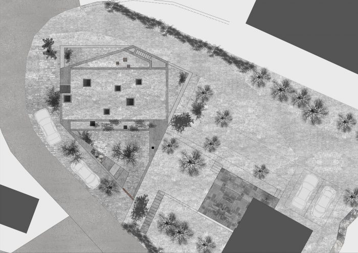 Towards the private street in front, the building presents itself as a discreet, single-story, closed structure. The only opening to the street is the steel gate leading to the entrance courtyard. A 3m wide forecourt with traditional natural stone paving and with trees connects the house to the street and enhances this space.
