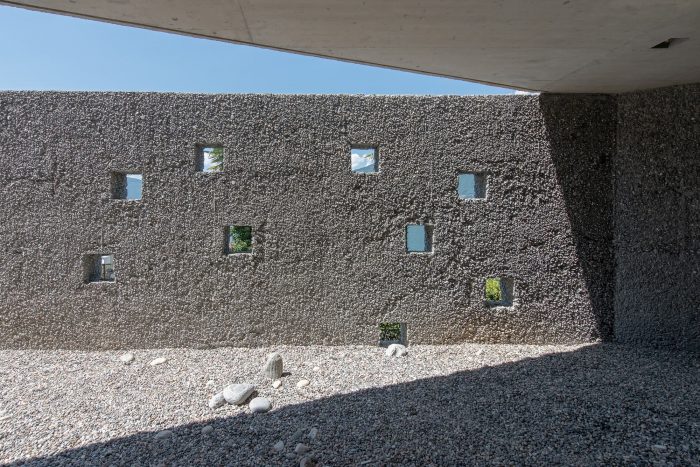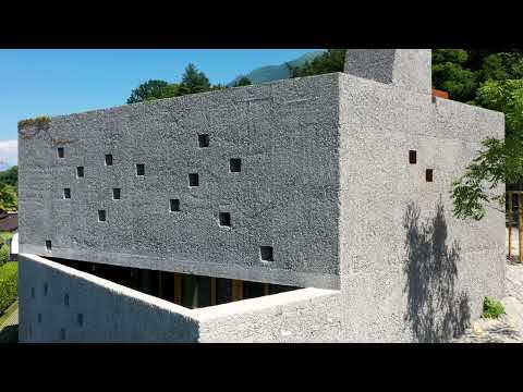 The polygonal exterior form and the morphology of the terrain make the building appear as an archaic rock. This impression is reinforced by the rough-washed concrete surfaces, which become increasingly darker through weathering, the climbing plants on the façades, and the few small square wall openings.