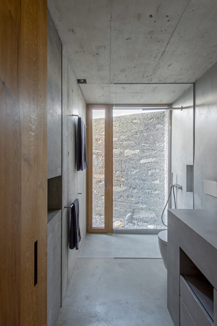 The entrance courtyard on the mountainside protects the house from views from the street and at the same time provides optimal lighting and direct sunlight for the living space. The closed walls of the courtyard on the lakeside reflect the sunlight into the interior. In a thick wall, there is an external staircase leading up to a small roof terrace, which offers an unlimited view of the lake and the landscape.