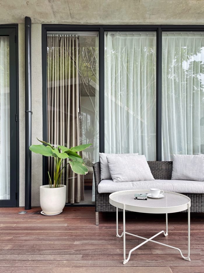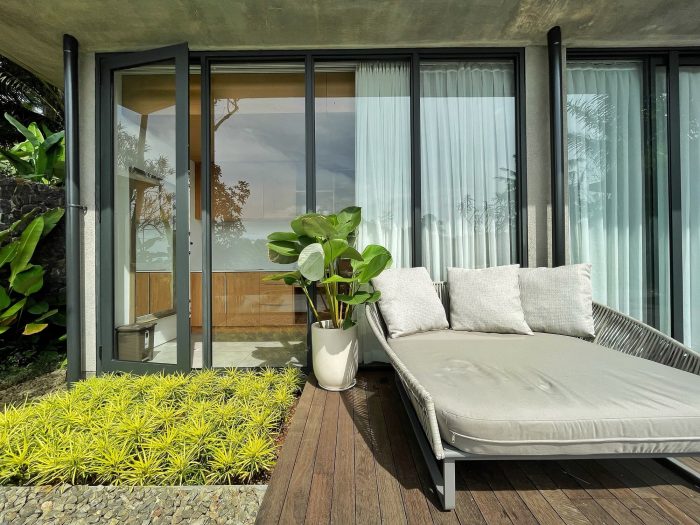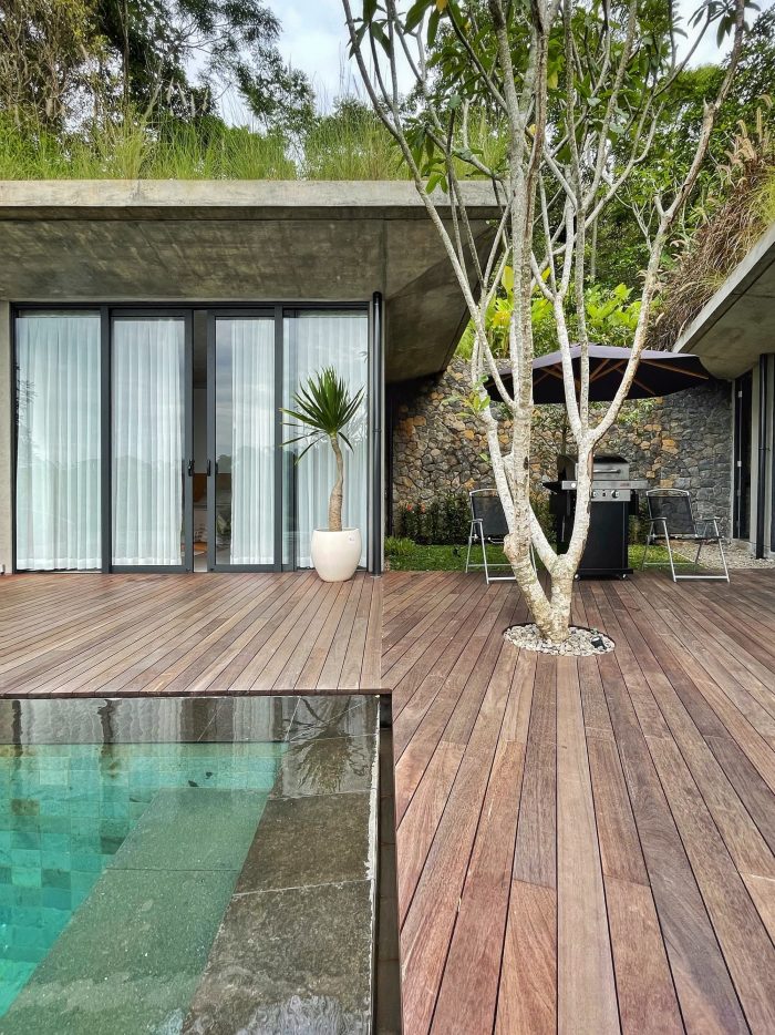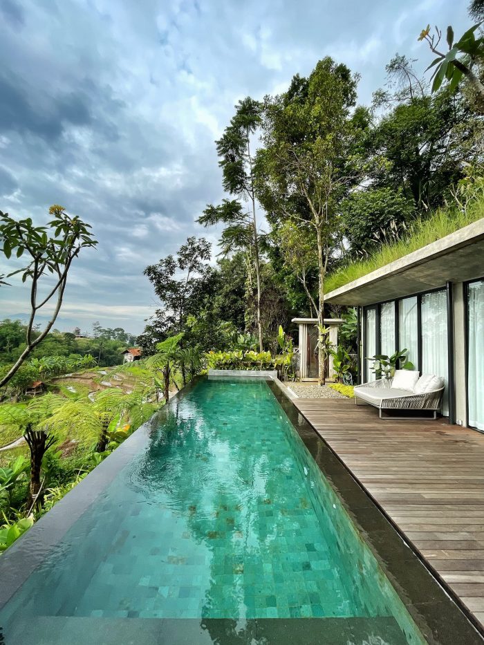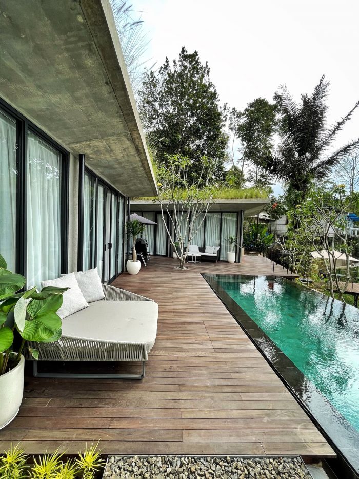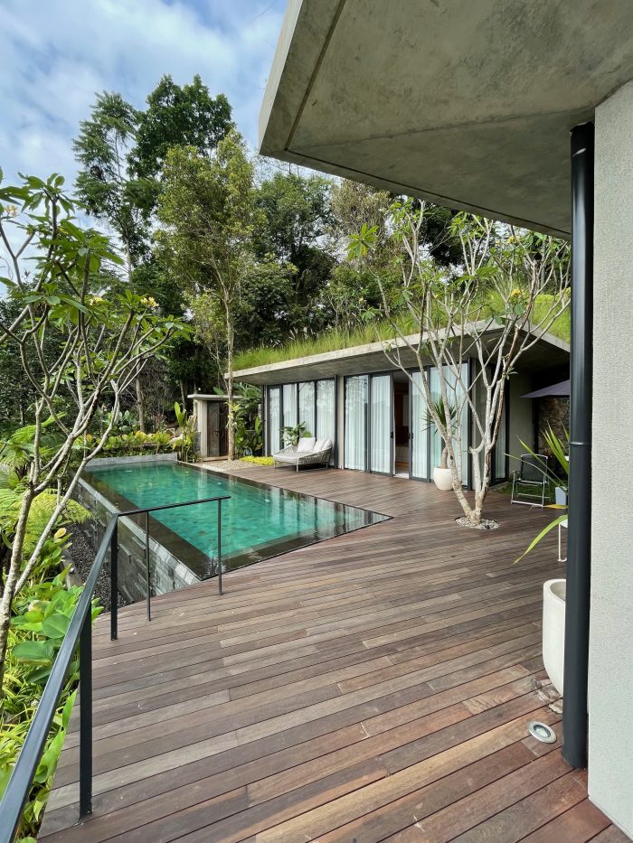 The villa also features a pool, which is placed at the edge with a wide deck, adding the impression of a private resort while also allowing for a full view of nature. Overall, the villa is designed for the residents or visitors to immerse themselves in the beauty of what surrounds them.