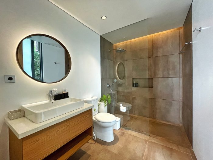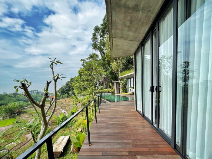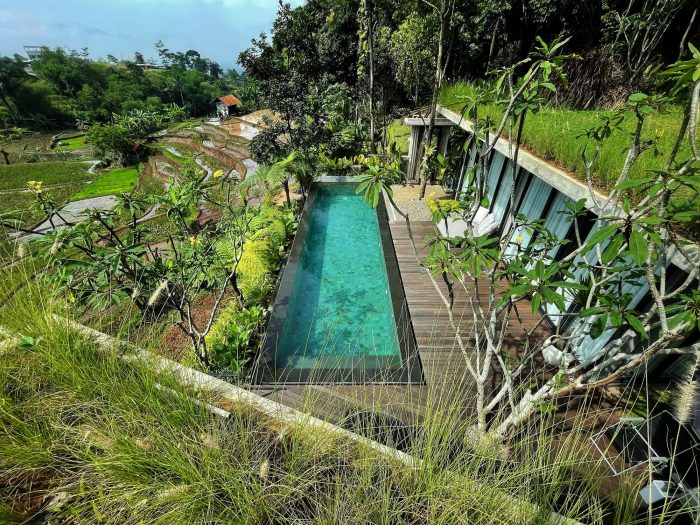 The villa is situated on a landscape with uneven contour and adapted around it. To maximize the field of view from the indoor areas, the buildings are split into two and constructed in a V-shape, with full height glass walls overlooking the rice fields around the area to allow a good amount of natural light to go in. Interior for the indoor areas are made out of concrete and wood. The interior features a bed, living room, kitchen, and bathrooms. In the outdoor area between the buildings is a communal space, with a table to gather around on.