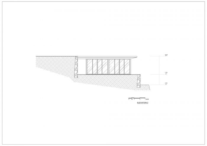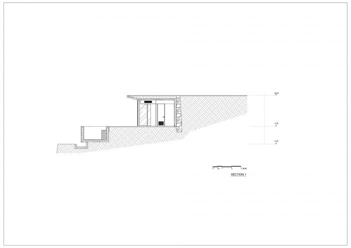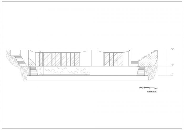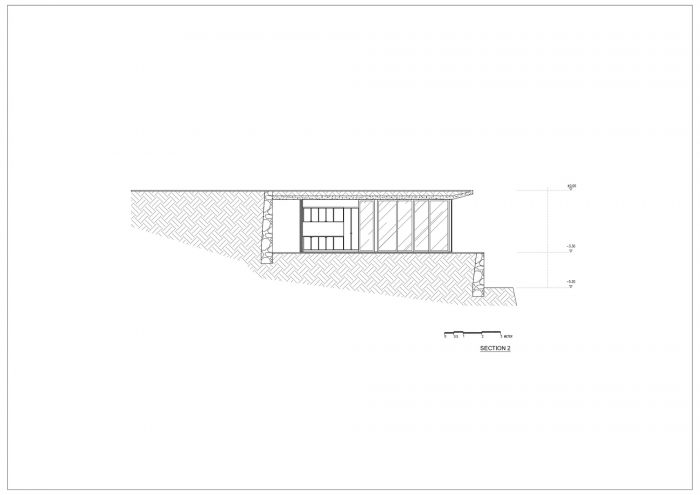 The roof of the villa is designed to be a garden, making the building blend with its surroundings. Flooring for the outdoor area is made from wood and the surrounding walls are made from stones, emphasizing the harmony between the villa and nature. In the upper garden and lower outdoor area, a number of trees are also planted.