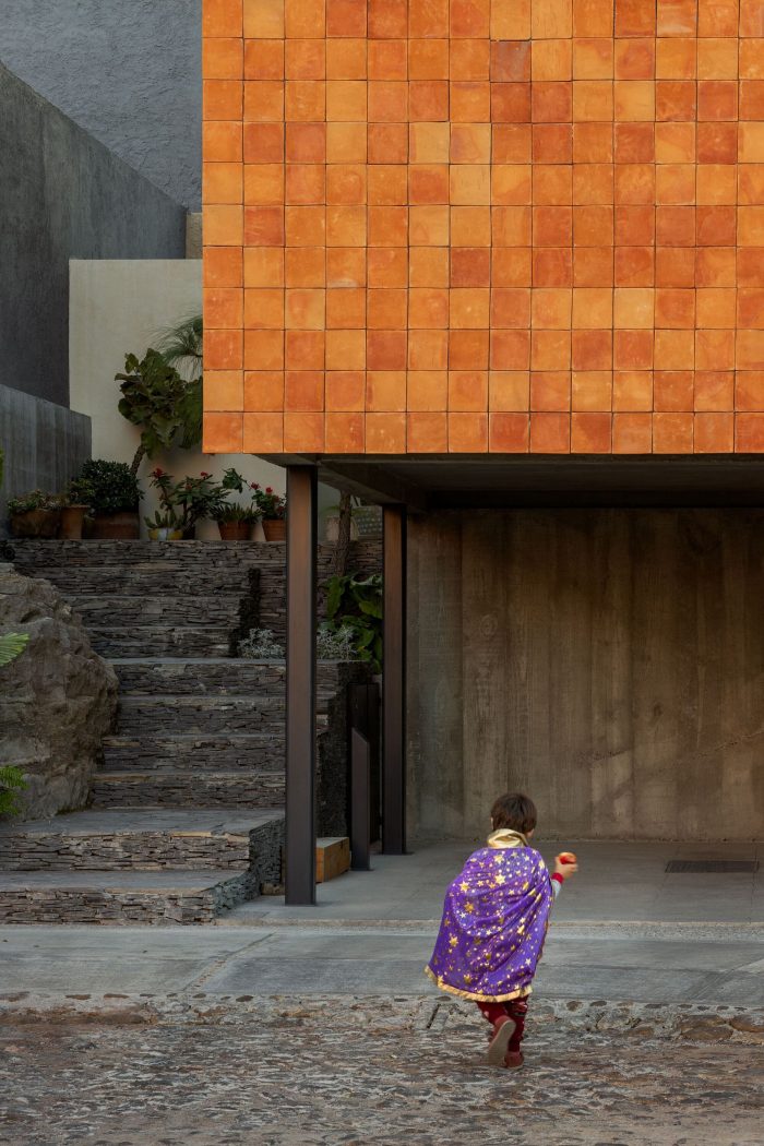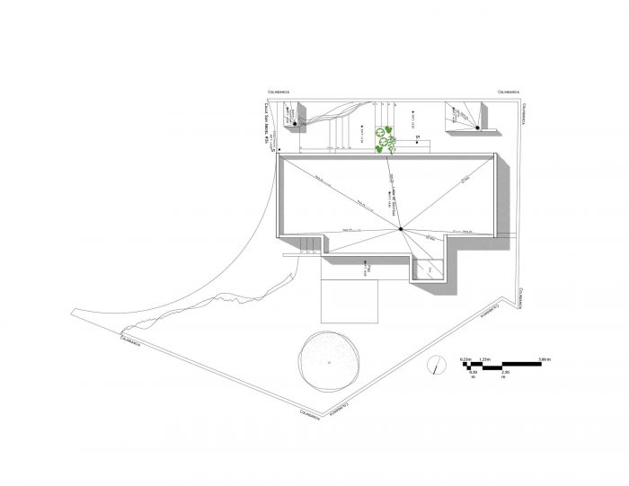 The terrain by nature rises almost 3 meters from the sidewalk so the access is ascending, covered with local flagstone caressing traces of the terrain that was left uncovered intentionally showing, in 2 points, the original rocky substratum.