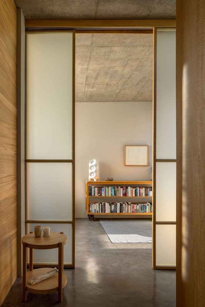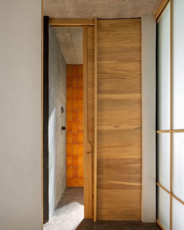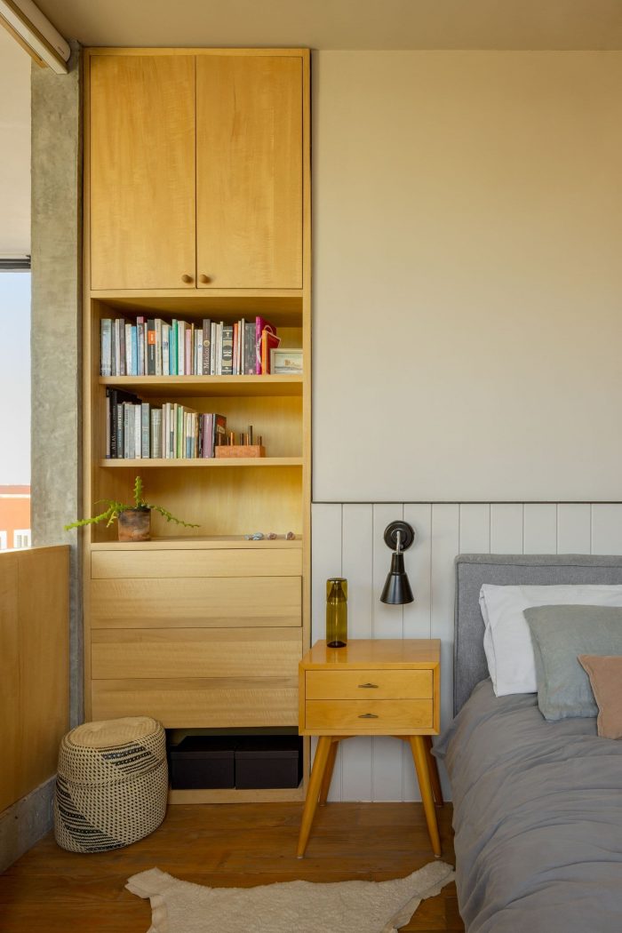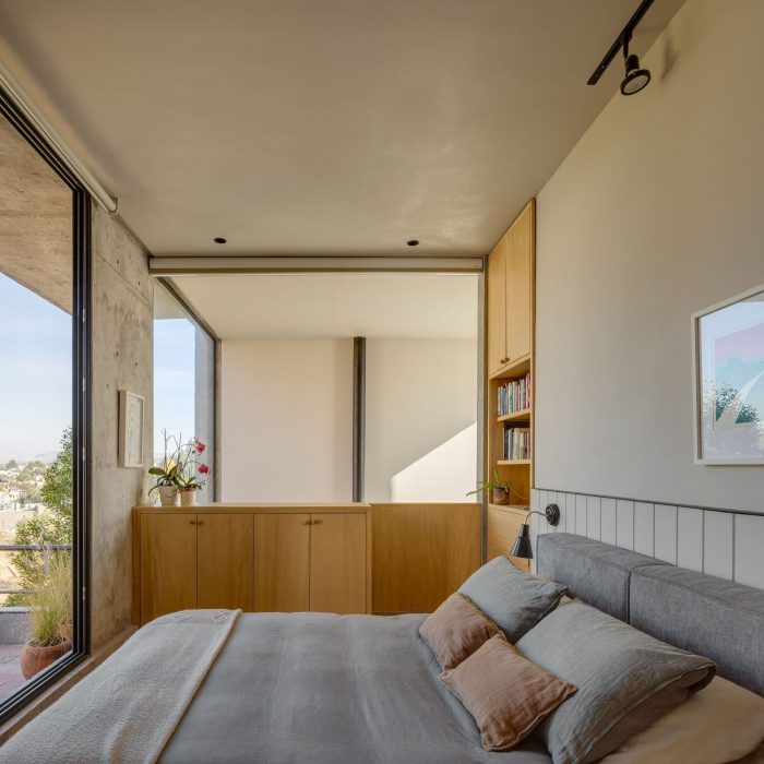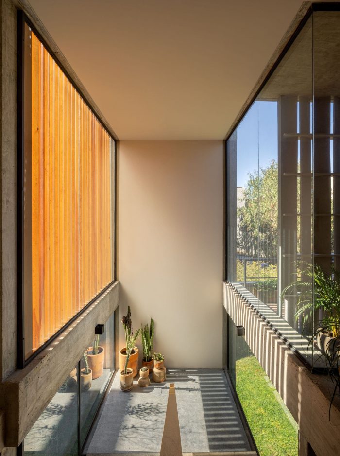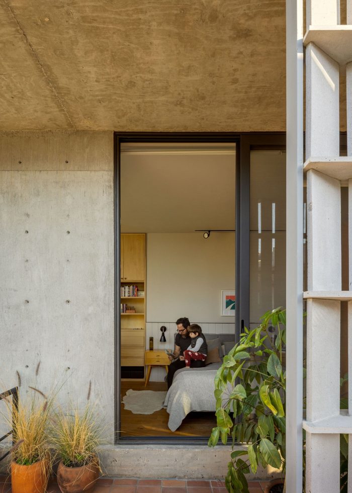 In the main bedroom, passing through the workspace or hall, you can see the double-height wall of the room that is closed with an automated blind that protects the climate from the large windows, the right space for rest, it is visually expanded to the terrace, which is an internal garden full of pots, and the gray quarry board that was configured on site, achieved a micro-environment, giving privacy and protecting from the southwest that affects less but hits and generates an interesting texture of this material.