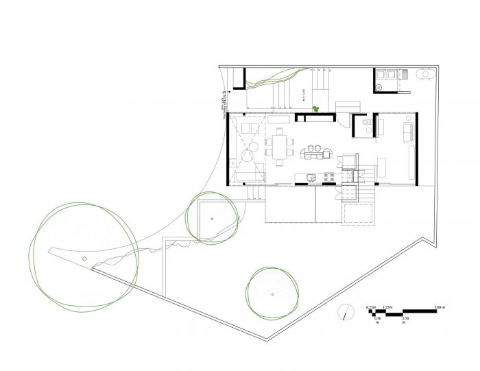 这座房子提出了一种生活方式,从与它所在的景观的持续对话开始。一个不规则的地形在一个封闭的街道的尽头,在某些部分合并到环岛的半圆形,完成了住宅区,TOMM的房子以其强大的直角个性而闻名。它是一个与属于城市的绿色区域相连接的体量。这个绿色区域是决定方向的触发器。街道的正面是完全盲目的,它的主要开口在东北方向。这个订单是为一个3人家庭设计的,优先考虑;与植被建立一个永久的对话,这是保证户外活动的原因,同时不忽视隐私。土地的多边形允许我们实现最高比例的花园面积,是可居住的区域和捐赠给公园的区域之间的交界处,证明了这种与地平线的观点的持续关系。