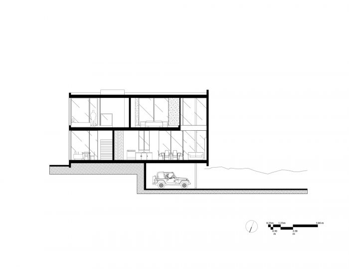 For the description of the project we will start talking about the access, it is by means of a local flagstone staircase with cambers and a rajuela side of it, recreating the solidity of a base from where the overhang to the garage is perceived.