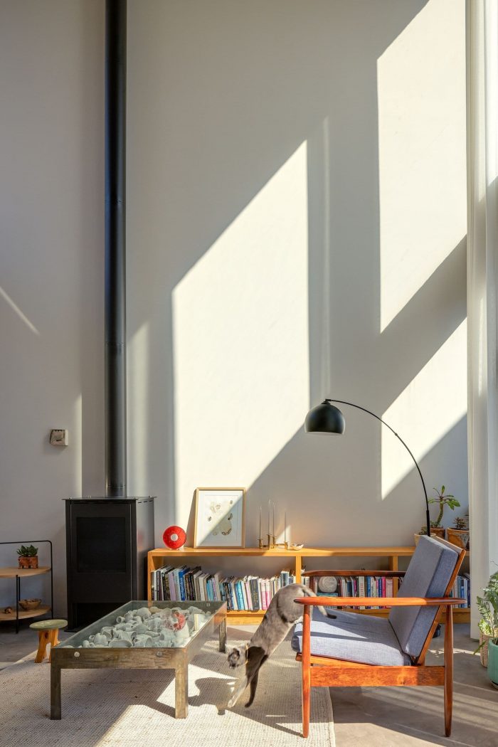 在主卧室,通过工作区或大厅,你可以看到房间的双高墙,它被一个自动窗关闭,保护了大窗户的气候,这是一个合适的休息空间,它在视觉上被扩展到露台,这是一个内部花园,充满了花盆,现场配置的灰色采石板,实现了一个微环境,给予隐私和保护,免受西南影响较小,但击中,产生了这种材料的有趣纹理。