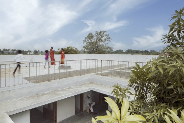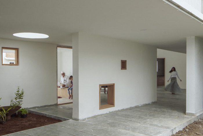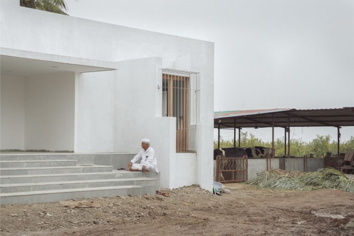 Very much like human tendencies the house sequentially unfolds itself, from single-height spaces for each family’s use to double-height spaces for accommodating the two families together as they have their meals in the dining room or discuss their day in the living room. The verandah welcomes fellow villagers and calves with the same warmth. The east-facing windows double up as rooms to provide refuge to anyone and everyone in the house and the intimate scale of it personally connects with the inhabitants. Since the family follows the tradition of storing grains and spare utensils, a store room is provided, alongside the utility area. The color palette matches the site’s context—whites for advocating the color men traditionally wear and every other color in the house to celebrate the sarees of the household women. The memories of the children, the rituals of the men, and the giggles of the women make up the decor of the house, paired only with a hand-painted bullock cart wheel or two.