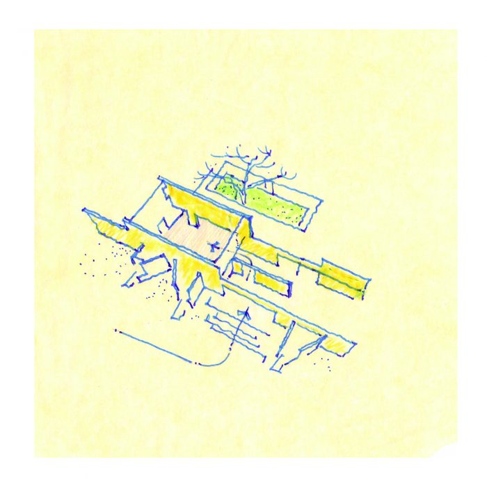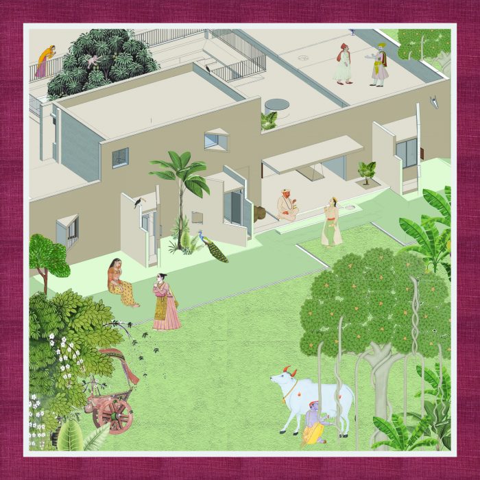 The house overlooks the old mango tree, and as one goes around it, the house spatially defines and blurs lines between people and nature. Walk in the courtyard corridor paved with natural stone, and a sparrow of two might fly over your head-the inclusion and respect for nature can be felt evidently. Although the family stays together under the same roof, spaces are designed with sensible appropriations to facilitate just the right quota of familial activities. Everyone has a place of their own—there are spaces carved out near the windows for reading, practicing yoga, or overlooking the farms. The kids, however, have the entire house to themselves; from the entrance to the big terrace, the house is blessed with. Undoubtedly and at all times during the day, everyone’s favorite spot in the house is always near the old mango tree, after all, it binds them to the roots while giving them shade, a sense of identity, and a whole basket of mangoes. Be it the unfolding of the morning newspaper in the courtyard corridor or bringing the calves in for a tour, the tree, and the holy tulsi vrindavan shower their blessing. After all, they rustle with and breathe on the same breeze that gives respite to the family members.