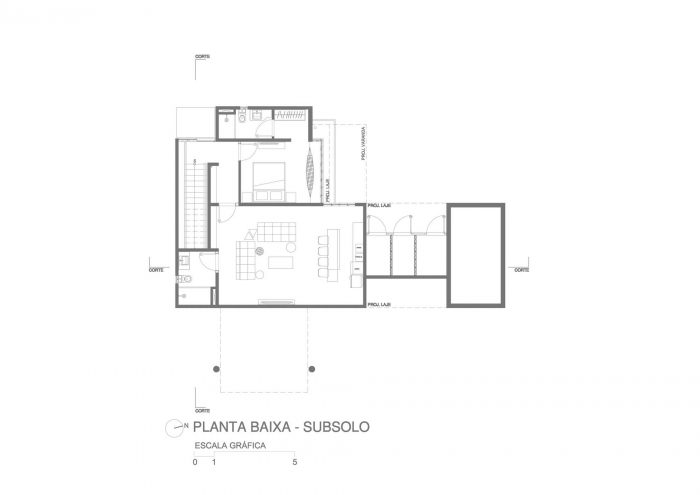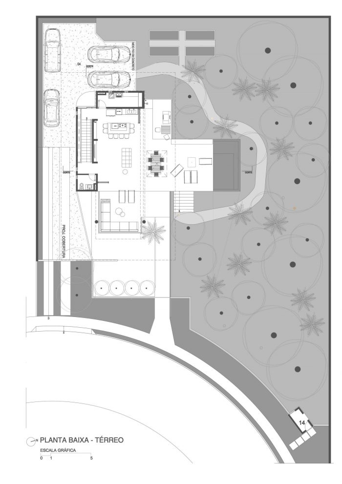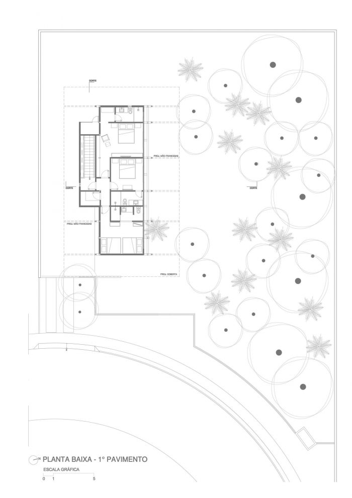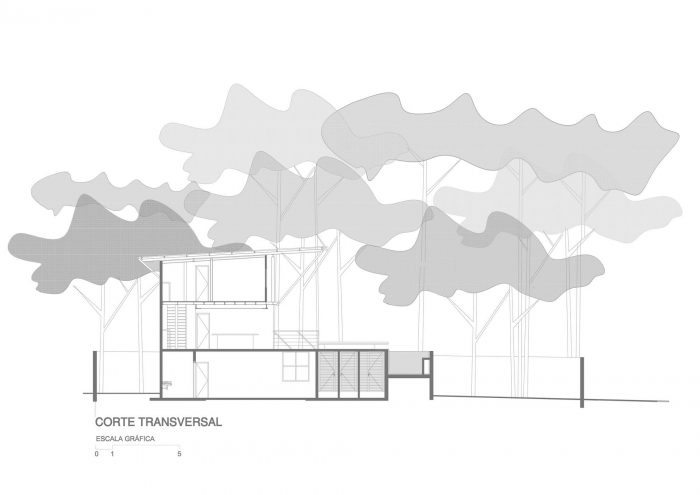 The gentle sloping piece of land with sandy soil and many trees led us to organize the program in three levels: one for leisure, leveled with the sidewalk, an upper level for the private areas, and a lower level for guests.