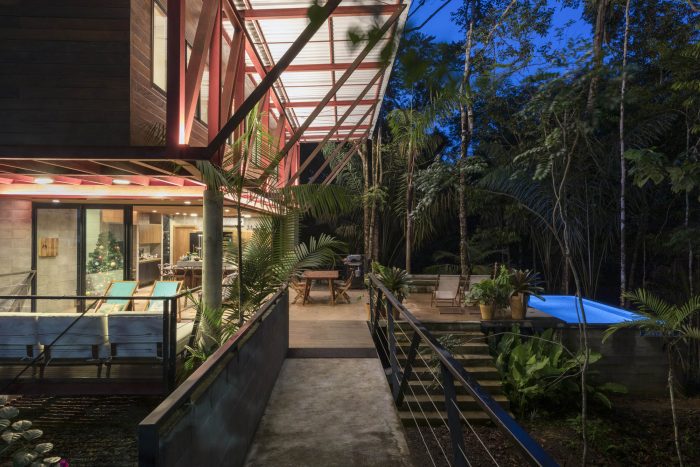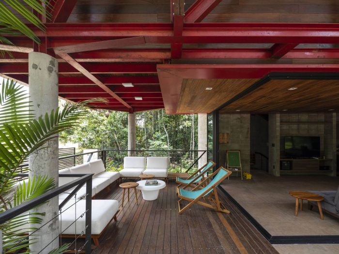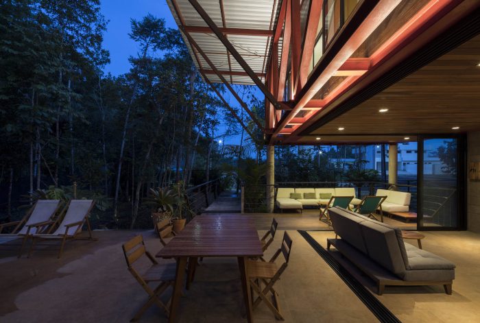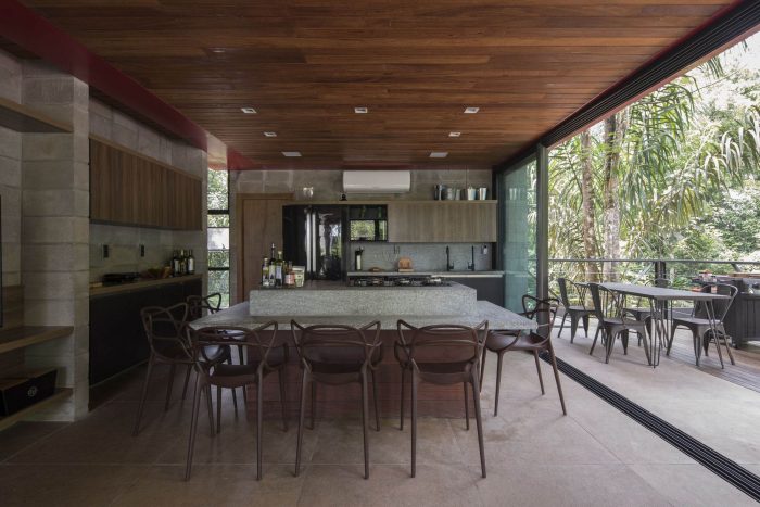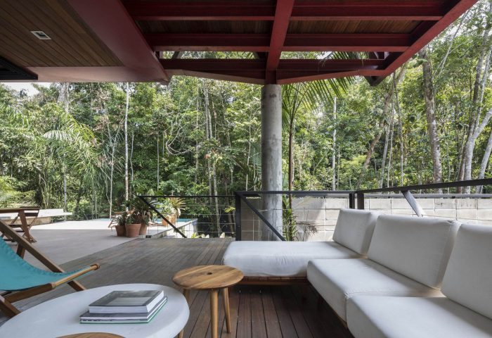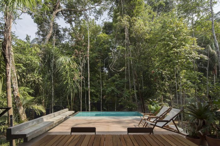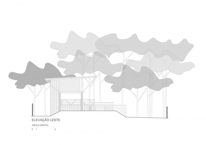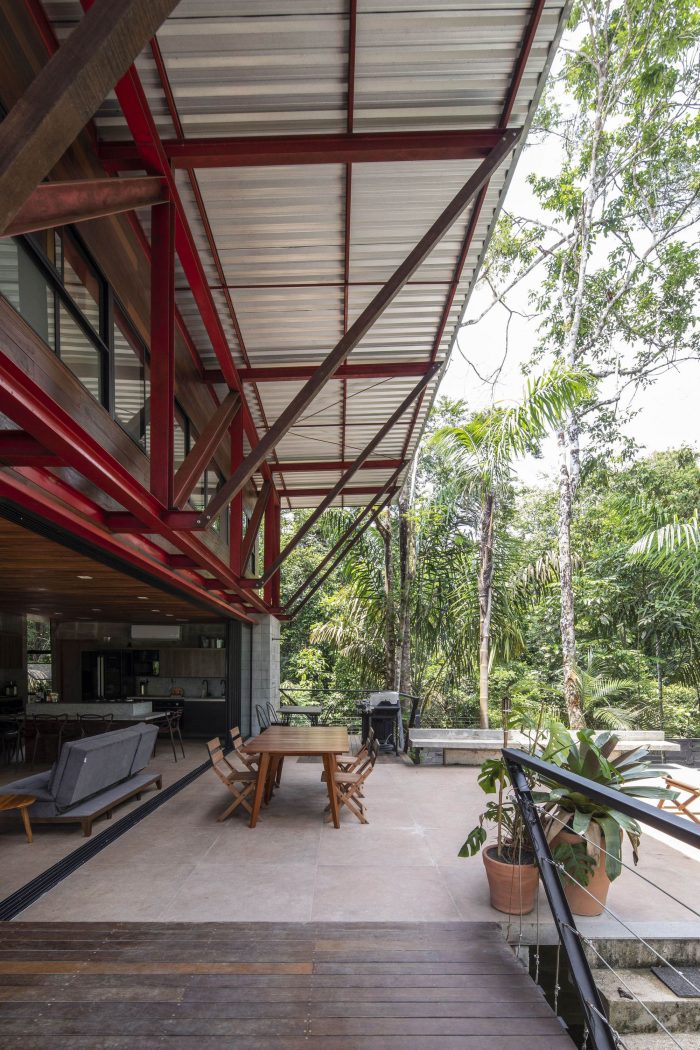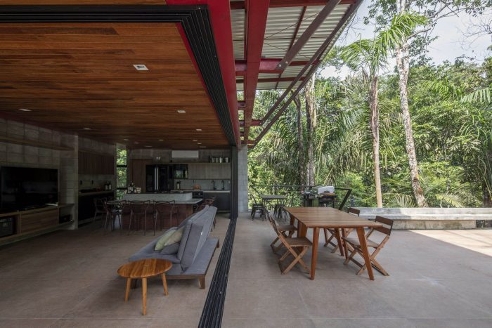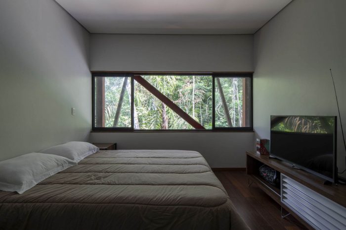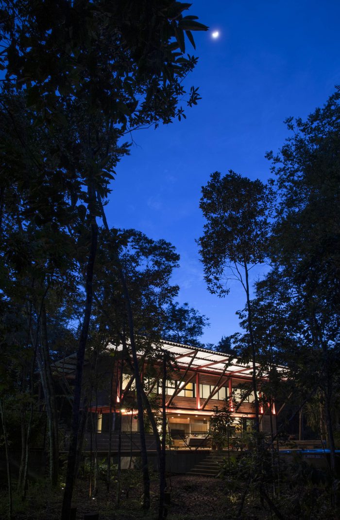The leisure and private areas were arranged facing the forest, taking advantage of the northeast prevailing winds, creating a partially covered integrated communal space that benefits from the forest and the path of the sun and moon.