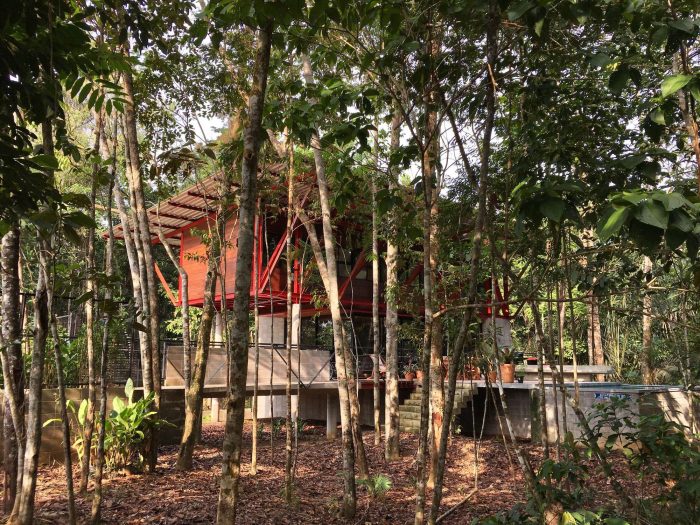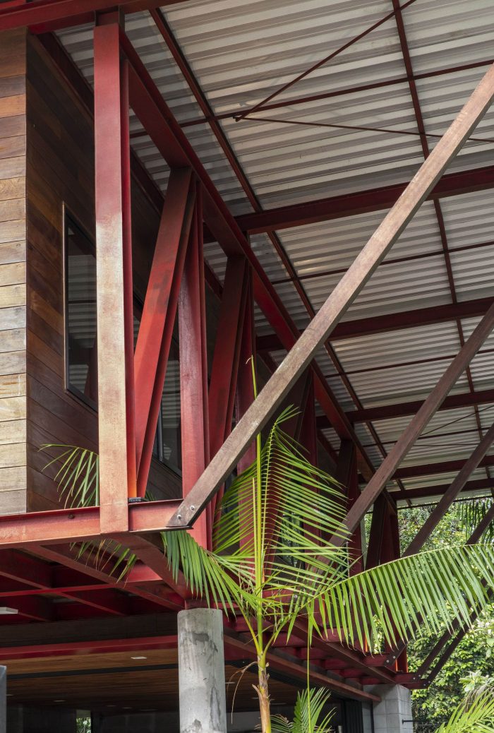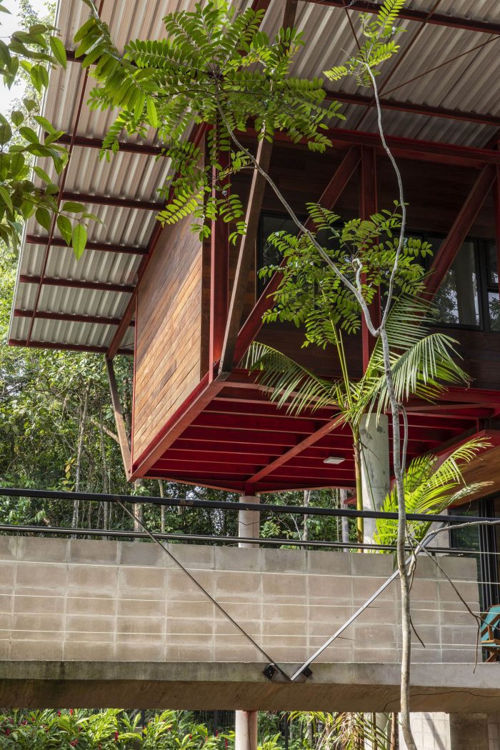 A large roof made of thermal sandwich panels with generous eaves provides the necessary protection from the rain and the Amazon sun. The fallen leaves on the forest floor serve as a low-maintenance permeable ground cover while also acting as a natural fertilizer for the trees.