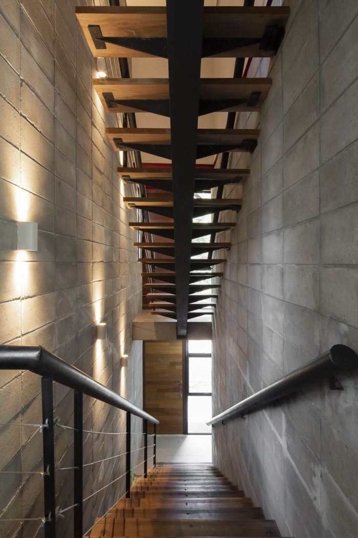 A load-bearing masonry box made of concrete blocks contains the staircase and the bathrooms while also supporting one end of the steel structure, which is supported by a pair of concrete pillars on the other end. Wood is used on the exterior walls of the elevated prism, the floor of the private areas, and the decks and ceilings of the leisure areas.