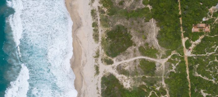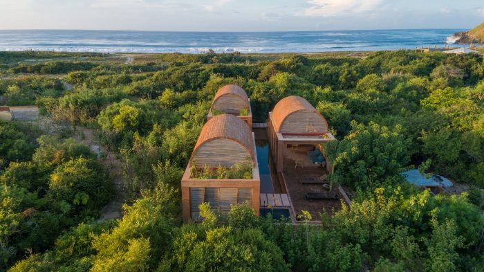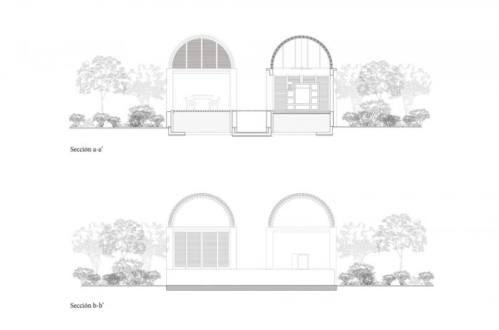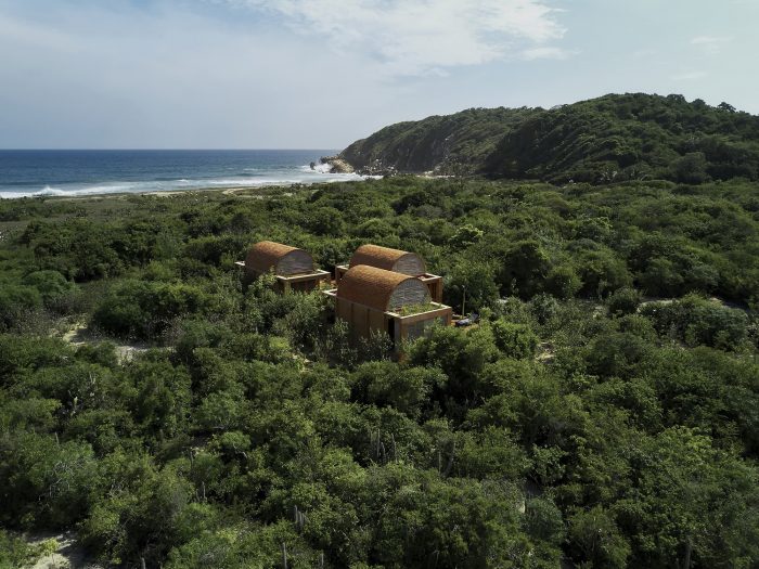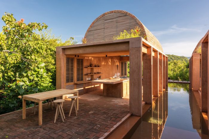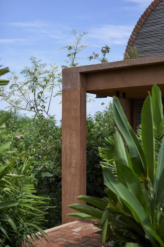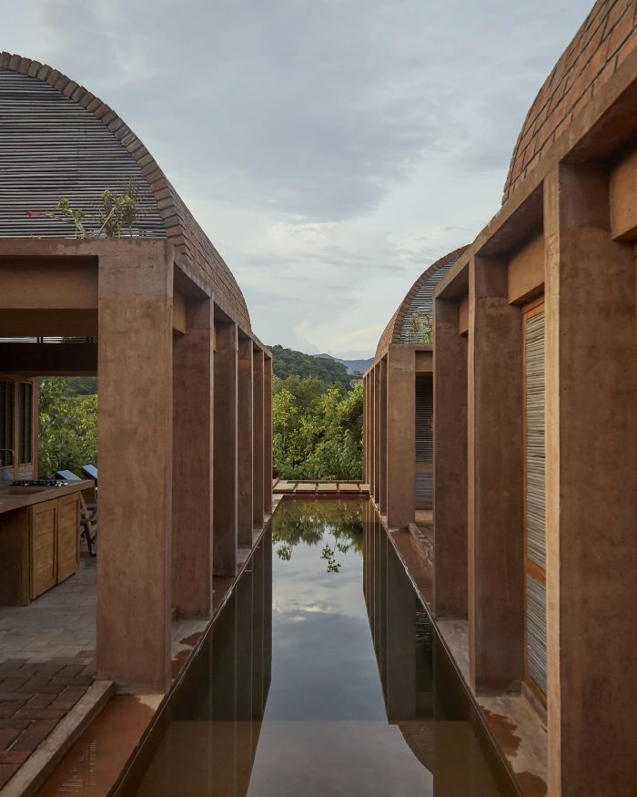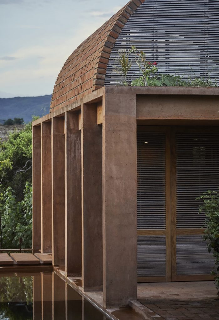 The first thing one notices approaching Casa Volta are three brick vaults floating in the middle of the dense Oaxacan coastal vegetation. Maybe it is just a mirage provoked by the heat and humidity of this place. Afterwards, following a small path deep into the vegetation, the vaults disappear. Then a clearing opens, and surprisingly a small bench appears next to a long pond surrounded on both sides by symmetrical columns and its reflections on the water. It seems that one has arrived to an abandoned classical temple.