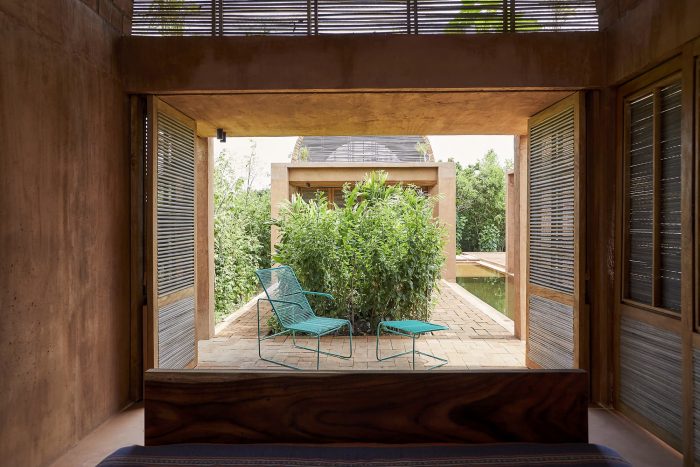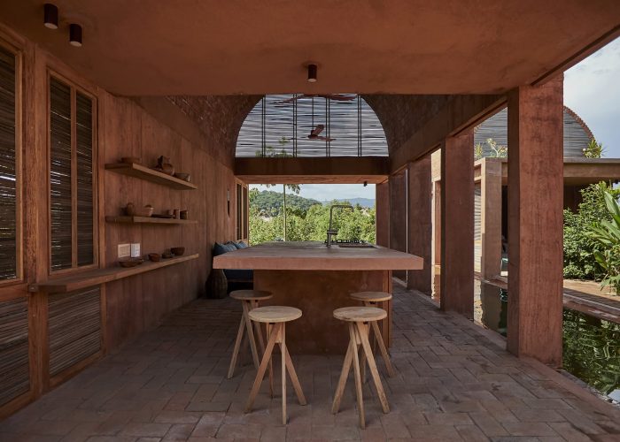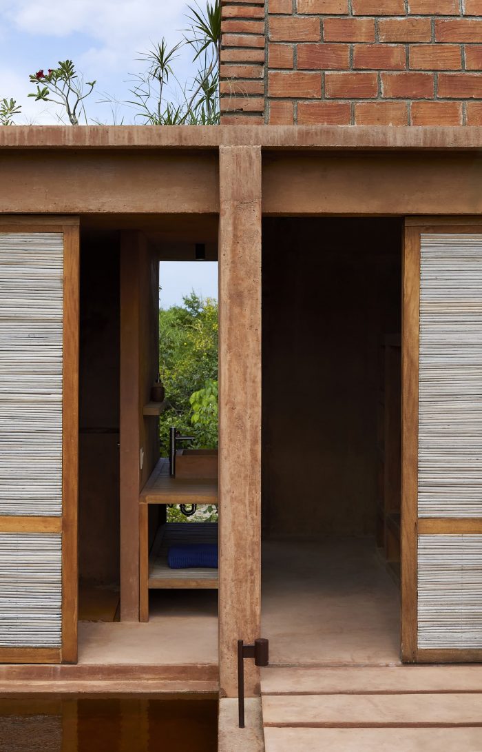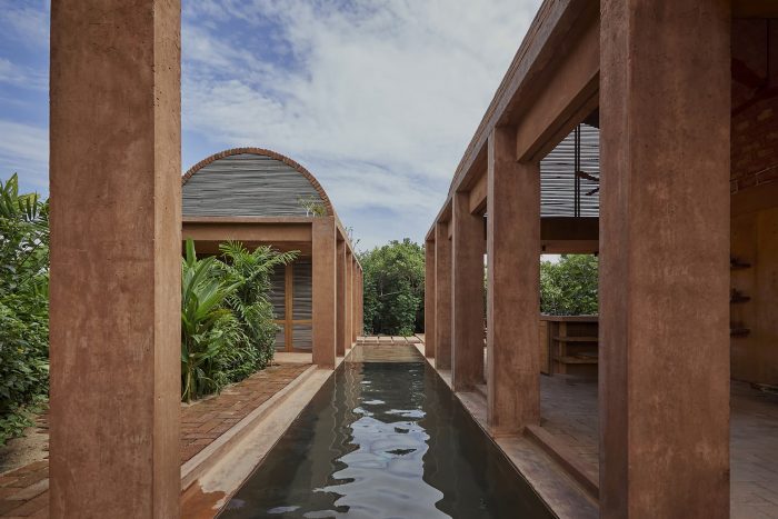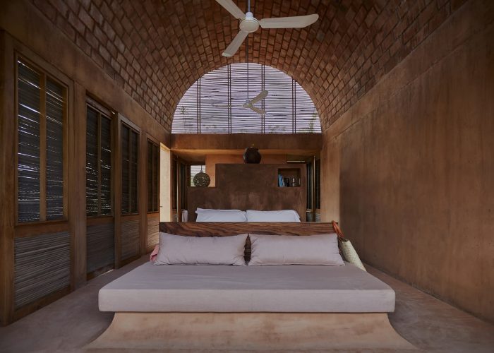 The house has a rigorous, Kahnian order. It is a rectangular plan subdivided in six alternating rectangular areas: three open courtyards, and three spaces covered by the vaults. The rooms and its bathrooms are located in two of them which open and close with timber and reed doors; the kitchen and living and dining area are located in the third one, which is always open. And at the centre of everything, water, as a constant presence, as a reminder of the closeness of the sea, that even if it can’t be seen from here, is just a mere 300 feet away. A practical and economical circumstance determined the materiality of this house. Foundation Casa Wabi is located nearby, a place where clay is fired, and where at the time of the construction there were leftover bricks available for recycling. So, the idea of using brick vaults built on top of a concrete structure pigmented with clay colour emerged. A simple construction method that would allow to fulfil the tight construction schedule. On the other hand, the vaults, along with the reed lattices on their sides, make the wind flow profusely in the closed spaces, while water refreshes the exteriors. All of this produces an atmosphere of warmth and freshness at the same time.