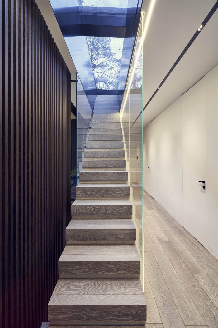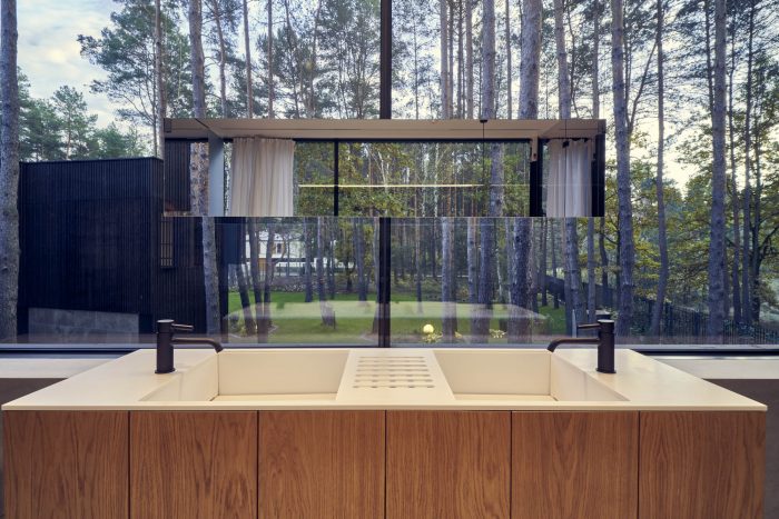 Part of the façade covered with natural stone penetrates into the interiors, blurring the formal boundaries of the architecture. Consequently, this nearly 450 sqm building creates a finished product stylistically coherent inside and outside that gives its owners a sense of constant communion with the building’s architecture, which does not compete with the natural landscape of the Kampinos Forest buffer zone.