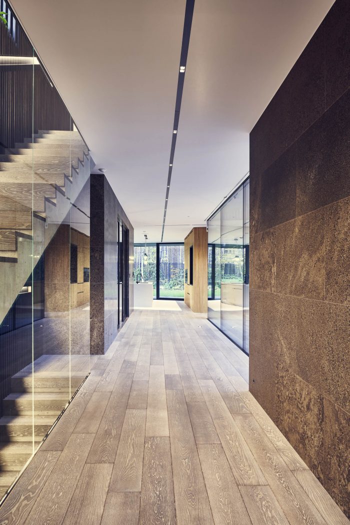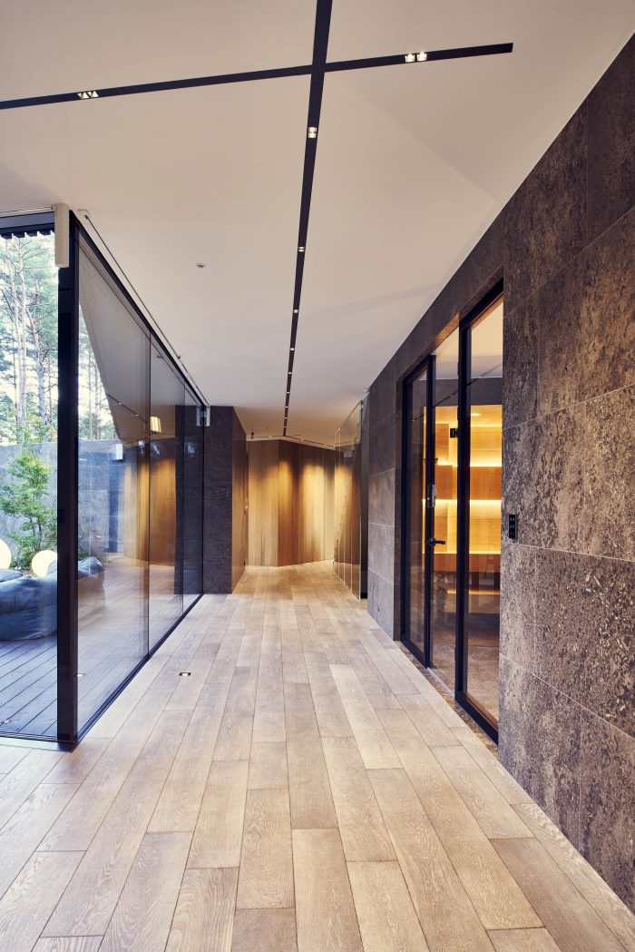 部分覆盖着天然石材的外墙渗透到室内,模糊了建筑的形式界限。因此,这个近450平方米的建筑创造了一个内外风格一致的成品,使其业主有一种与建筑不断交流的感觉,这与坎皮诺斯森林缓冲区的自然景观不相冲突。