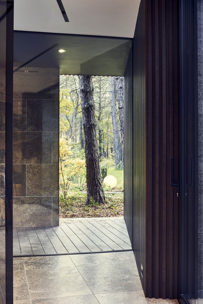 The sandy soils and soaring silhouettes of slender trees give the place an unusual, somewhat cinematic ambiance, which enchanted the investors and inspired the Warsaw-based architect Przemek Olczyk of Przemek Olczyk Mobius Architekci. I did not give much thought to the shape of the building while designing it. I marked out wooded areas on the plot and wanted to leave them intact. Then swirling around them, I began to draw further sharp lines of the house, cutting out space. This is how the concept was created, which suggested or dictated the building's shape - says the architect.