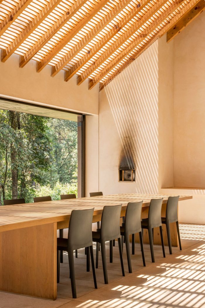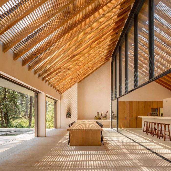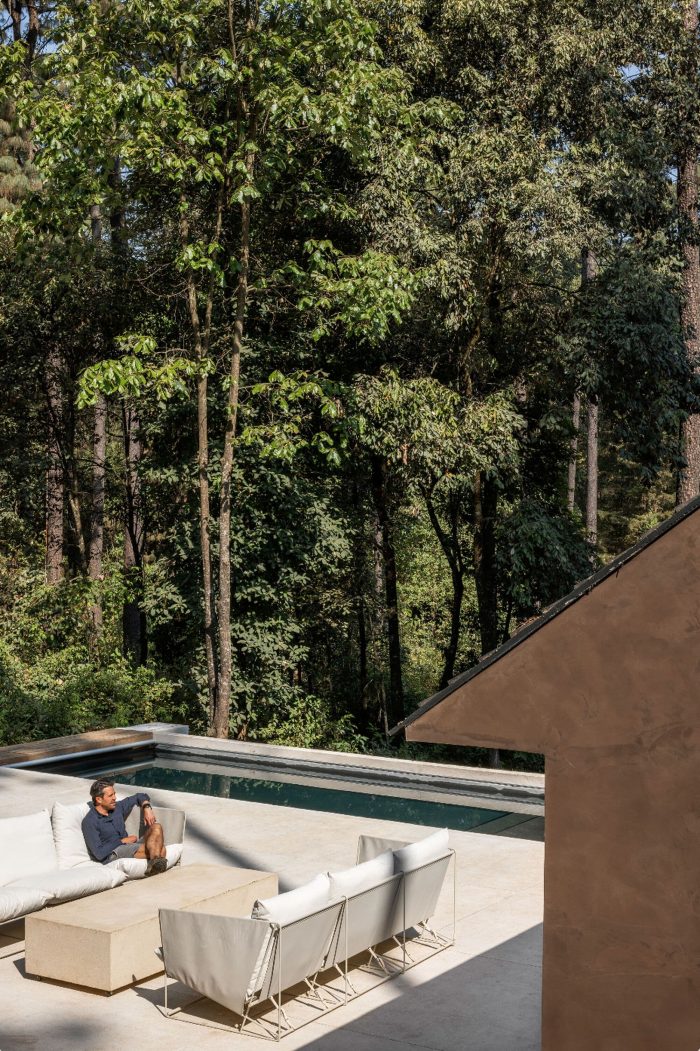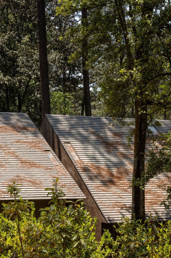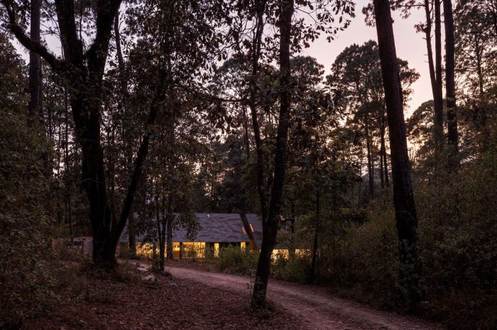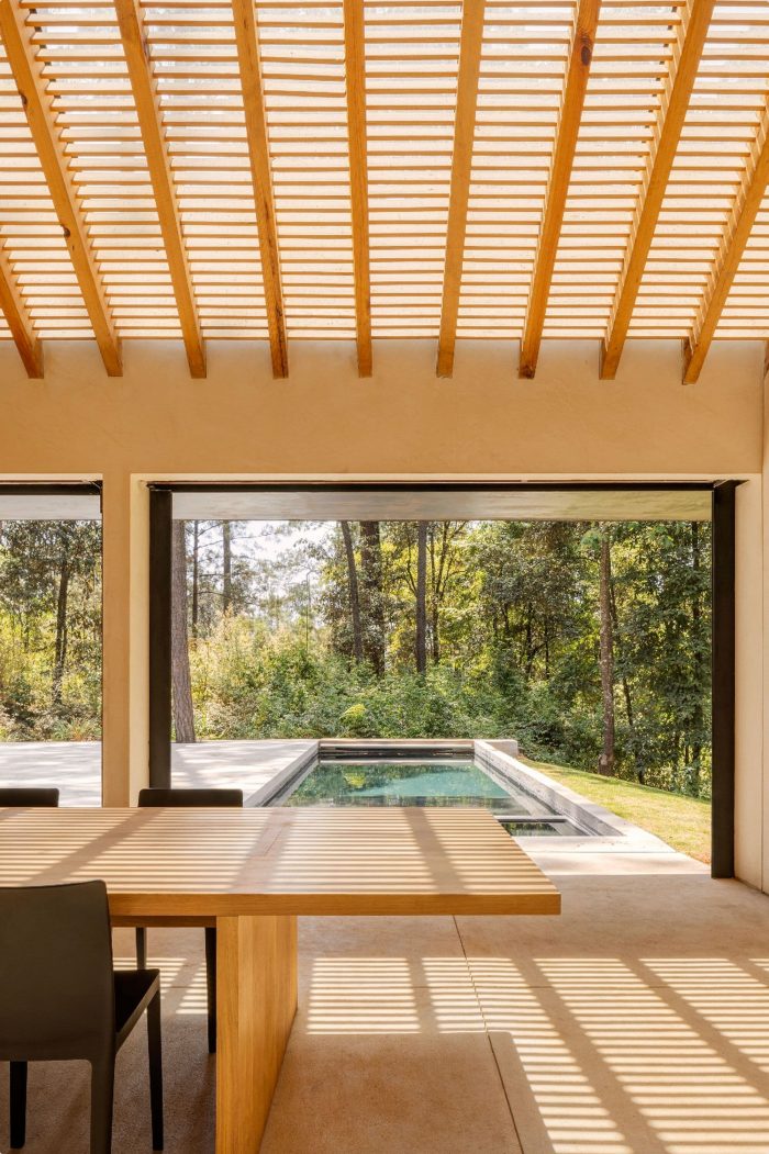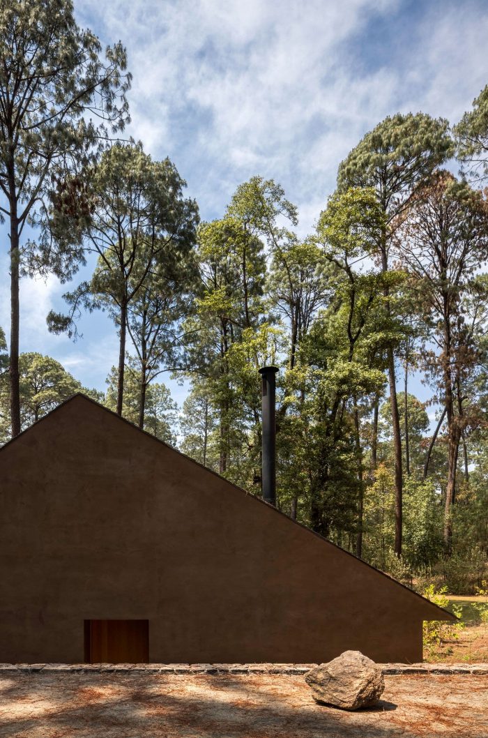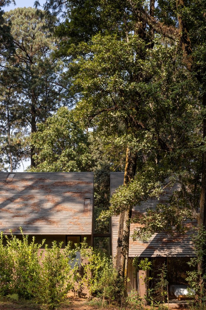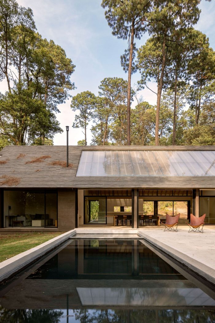 The Zarzales project is a vacation home located in Valle de Bravo surrounded by nature. It is ideal to return to the most basic and works as a rest space connected with the natural environment, with pine trees around the perimeter that allow the project to be lost within its surroundings.