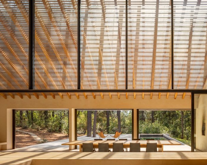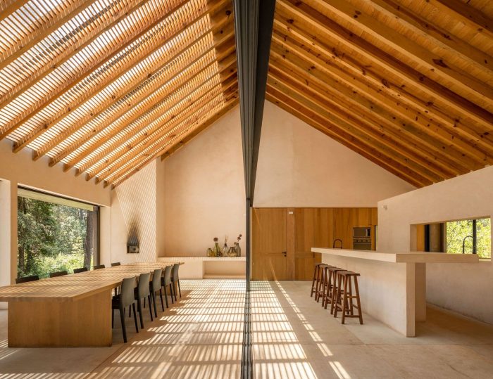 The construction is made with gabled roofs, due to the constant rains in the area its located. With amply lit spaces, no space truly feels interior, causing the boundary between inside and outside to virtually disappear.