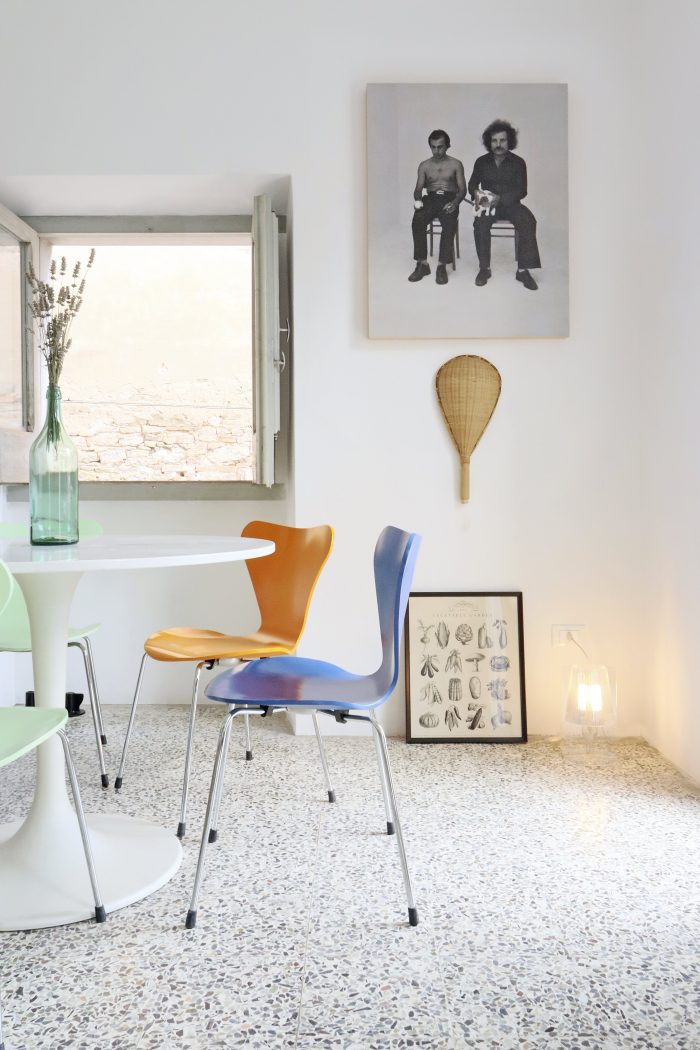 Some inserts, on the other hand, recall the transition that the house made during the 20th century through important design icons. In the sleeping area there are cantilever chairs by Mart Stam and in the living area the colourful Series 7 by Arne Jacobsen.