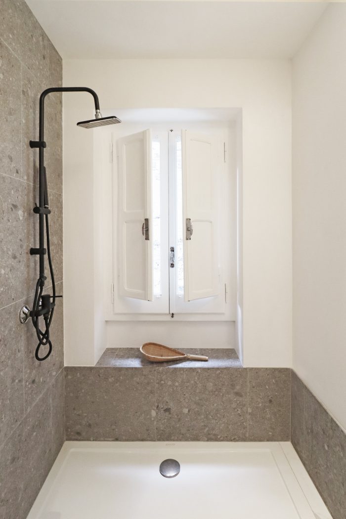 The bathroom, as in most houses in the old town, was the last room added and is typologically an alien body. It has been completely rebuilt with a Ceppo di Gré stoneware cladding, seeking a dialogue with the restored 'terrazzo' floor of the rest of the house.