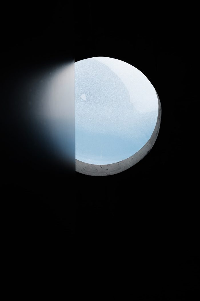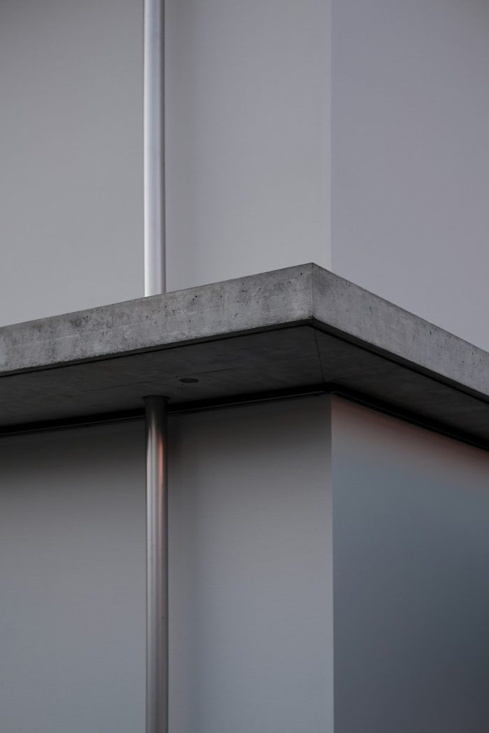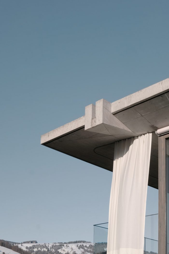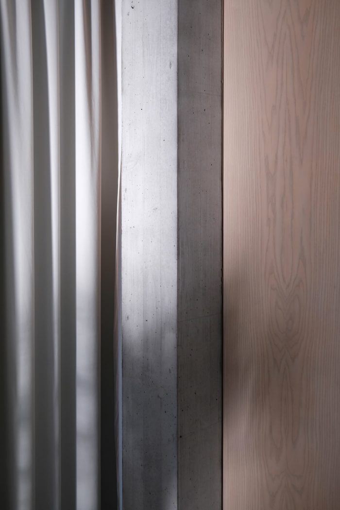 At the beginning, we experimented with different hybrid constructions and load-bearing systems to generate enough storage mass for the warm summer days on the one hand and achieve a slim wall structure on the other. The result is a load-bearing skeleton structure made of concrete with prefabricated wooden elements as exterior walls and a stretched textile façade as weather protection. The cantilevered floor slabs with external curtains provide additional sun protection and create a private outdoor area. Together with the sunblinds, the curtains, and the façade, the house is wrapped in a textile dress. A spout stages the drainage of the large roof areas and fills a well on the terrace that can be used to irrigate the garden.