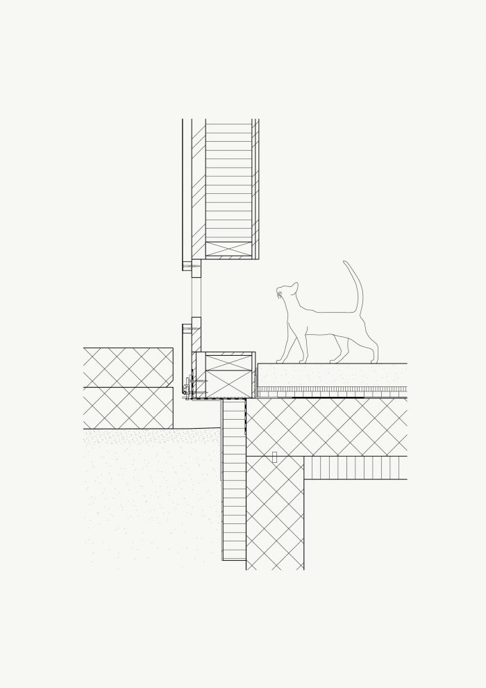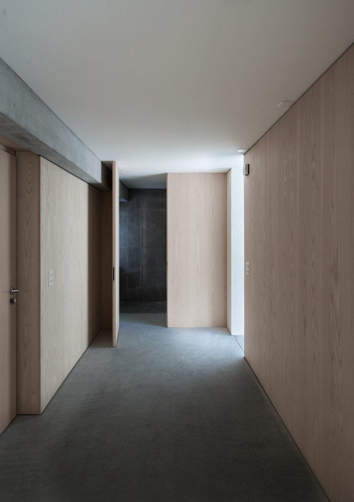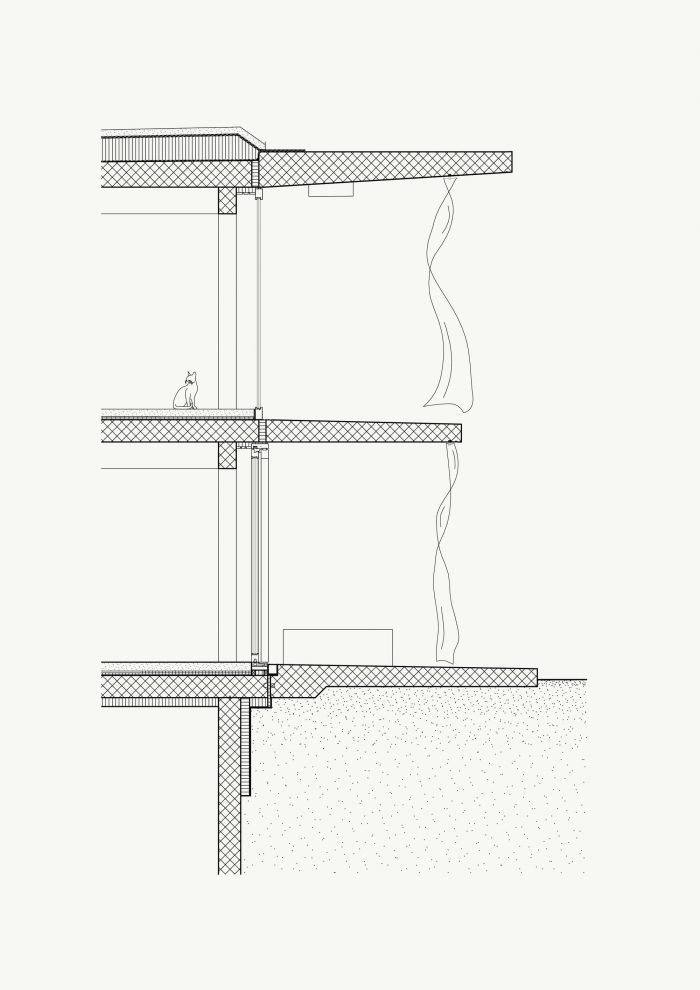 The building is three stories with a basement and consists of three identical floor plans and recalls the logic of old barn houses in the region. The servant spaces in the back house consist of a staircase, a bathroom, and a pantry. The served spaces in the front house consist of the living and dining room and the bedroom. The partition walls are designed as built-in furniture to allow for subsequent adaptation and to create as much storage space as possible.