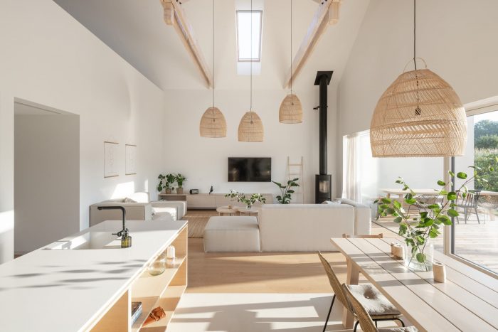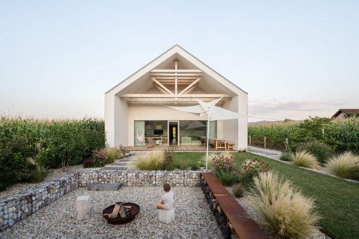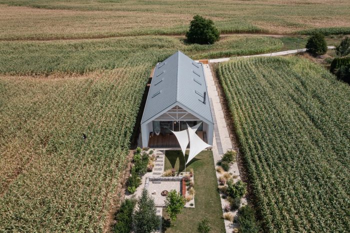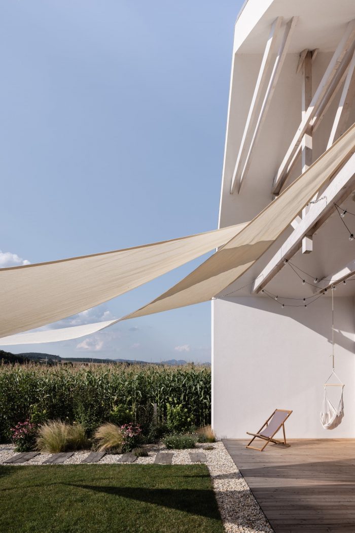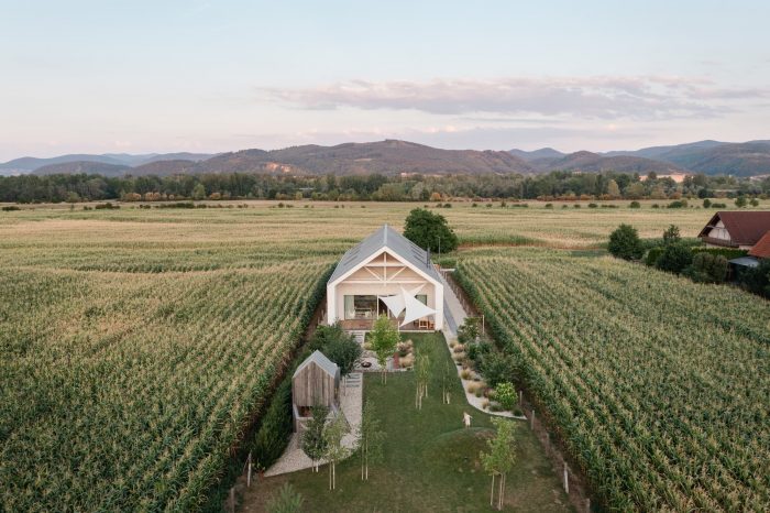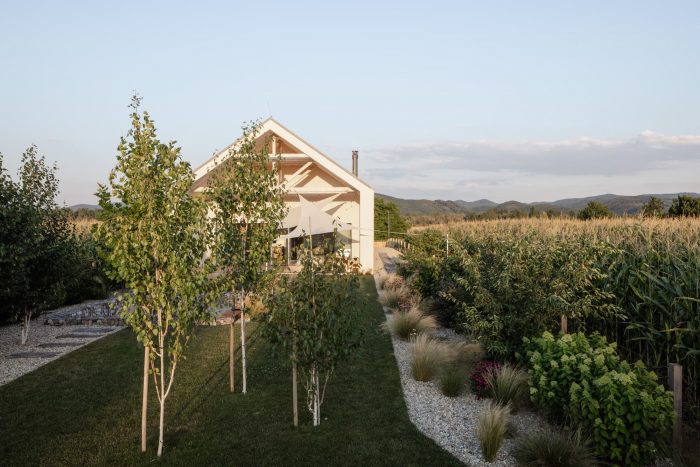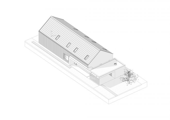 The authors decided to use wood without surface treatment mainly because of its natural aging, which will contribute to the fusion of the building with its surroundings. The material composition is completed by traditional white plaster and roofing made of gray corrugated metal. The interior is characterized by a combination of wood, white plaster, and natural materials. The composition is complemented by black accents of details.