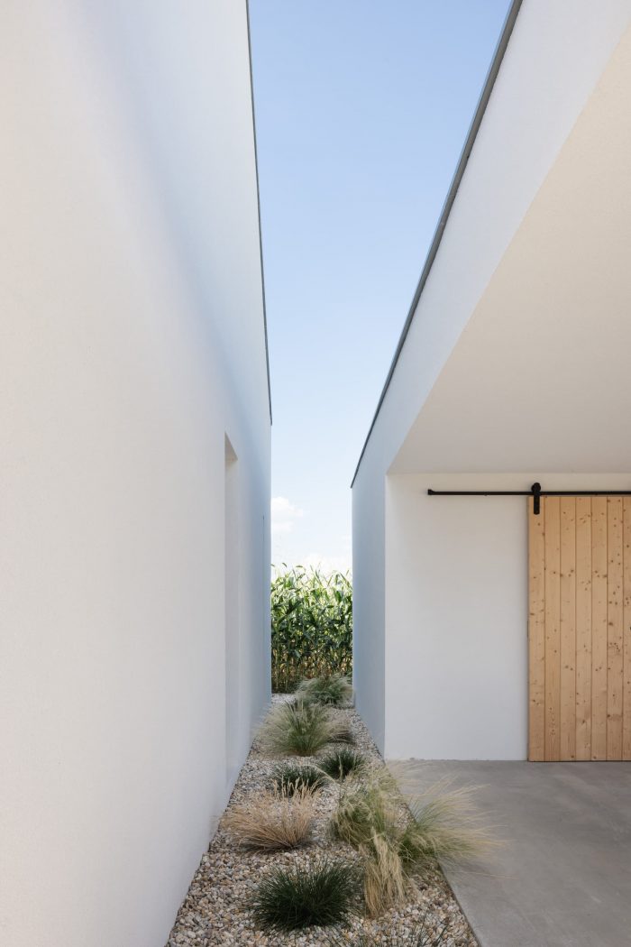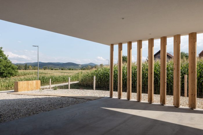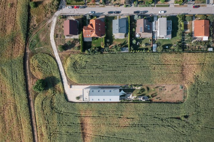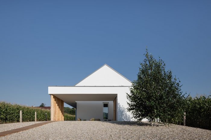 The project of young authors Monika and Marek Ivanko from the Monmar atelier tries to find an answer to the question of how to combine the life of a young family and work. Therefore, they designed a house that, in addition to the primary living area, also creates space for their atelier. The realization also serves as a "showroom" of their work. "We are not afraid to bring the client to our home and show him how the house could look and have a function" the authors add. A simple rectangular house with a gable roof, respecting the local character of the landscape and buildings, is located at the end of a cul-de-sac, surrounded by fields and meadows. Due to its direct contact with the surrounding greenery, it looks as if it has grown naturally from it.