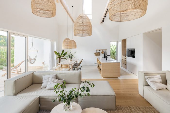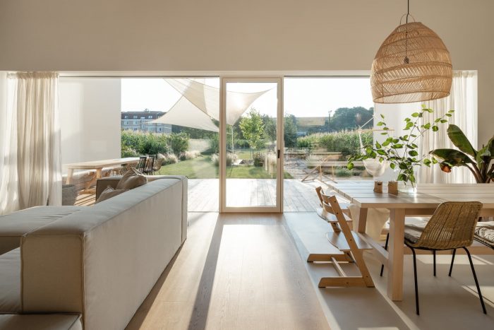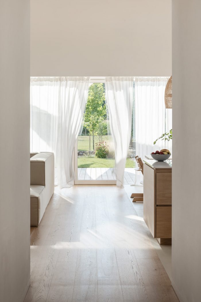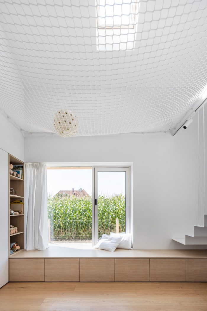 几乎在屋檐墙的整个宽度上开口,将客厅、餐厅和厨房与一个大的有盖阳台连接起来。一楼和一楼的空间由一个开放的画廊连接。一个单臂楼梯通向可从儿童房进入的阁楼,阁楼的天花板是开放的,里面有一个步行网。它扩大了生活区域,同时保持了儿童房各区域之间的联系。在一楼,有一个画廊和一个独立的房间—儿童的睡眠区。